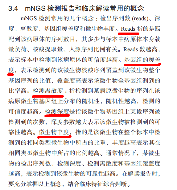 临床样本中病原体检测方法有很多,包括: 鉴定培养物中生长的微生物。 通过血清学实验检测特定微生物的生物标志物 通过分子生物学实验进行单个或多重病原体特异核酸检测。 这些方法虽然多,并且可以组合应用,对于常见高发感染也非常有效,但是它们都属于试错型,高度依赖于临床医生的判断选择。 目前在重症感染病例的诊断上,试错型尝试病原体检测耗时较长,临床总体阳性率也比较低。临床mNGS的技术特点是能够大范围甚至是全方位试错,为临床医生提供了一个快速的检测手段。但目前由于新技术的成本较高,且mNGS与宏转录组学测序( mtNGS)存在差异,导至临床敏感度与预期相对较低,简单地增加成本投人能有效提高临床敏感度。此外,临床mNGS除了测序生化反应外,还包含了病原体数据库自动分析比对专家系统,对于检测结果的准确性也非常重要,故不是一个简单的测序反应。一线工作人员,尤其是从事重症病例治疗的医生,需要对mNGS的临床应用有更多的了解,才能使mNGS更好地服务于临床。 mNGS报告通过测序短序列的数量(reads)进行物种的鉴定,碱基序列片段数量越大,表明该物种在样本中存在的可能性越高,但需要区分不同物种。同时需要考虑基因组的覆盖度,覆盖度与可信度呈正相关,但并非呈线性正相关。具体参考2019年的专家指南中mNGS检测的专有名词解释。 阴性结果的解读: mNGS报告中的信息是经过特定阈值过滤后的结果,如果是阴性报告,首先需要分析患者的具体情况,再研究除报告外的原始检测结果,判断是因为未达到阈值误判,还是确实不存在病原体。可以根据具体的临床信息,在报告阈值之外考虑可能的原始检出感染病原体,如胞内感染菌。在阴性结果中,如果没有进行RNA的宏基因组检测(也称为mtNGS),可能遗漏了以RNA为遗传物质的病毒,需进一步检测宏转录组以明确病原体,如一种新型病毒性脑炎RNA病毒的发现,否则存在假阴性的可能。对于某个临床样本,mNGS和mtNGS都为阴性的情况下,且内参检测值提示该样本中单位体积内(通常为1 mL)已知最小病毒小于10个分子时,可以考虑阴性价值,即患者不存在感染性疾病,可能存在免疫性疾病和肿瘤等。 阳性结果的解读: 因不同部位临床样本的背景微生物存在差异,故阳性的判读需要建立阈值才可以将真阳性的病原体从背景微生物中分离出来。这些阈值可以包含一些指标,如检出特定微生物序列的数量、归一化为每百万序列的相对值、检出微生物的基因组覆盖度及内参对照的检出等情况。但需要在相同的测序平台、相同的实验室进行比较,以排除平台和环境差异带来的影响。而当某个鉴定达到阳性判断阈值后,其增量与可靠性呈正相关,但并不呈线性相关,在未达到阈值时,其增量与鉴定可靠性呈指数正相关。因此,在判断阳性时,达到阈值即可信。此外,在阳性报告中,如果有多种微生物大量存在,则应结合定植微生物考虑假阳性物种。而针对一些常见病原体,需考虑并增加耐药基因的检测,以提供更多的临床治疗指导方案。这里为常见的21种的病原体和32种抗生素。 非体内正常定植菌的外来侵入性微生物在非感染部位出现,一旦被检出,即认为是病原体。 延迟阳性:有一些病原体由于被吞噬细胞吞噬,经一段时间裂解释放核酸后才能被检出,需考虑多次送检。 物种差异判读:不同的病原体类型对应的阈值不同,应分类解读。 病毒: 一些显著区别于人基因组序列的病毒,如腺病毒和流感病毒等,有少量的特异序列检出即可信,其阈值通常在3/100万及以上即为可信;而一些与人源序列相似度高的病毒,如反转录病毒类,在检出序列较少时,因无法判断是否来自一些转录元件,只有更多序列检出时才可信,其阈值通常需要超过1000/100万,因为哪怕确实是某类反转录病毒,相对较少的检出序列也更多指向其在人体内是潜伏状态,而不是感染状态。 真菌: 真菌的基因组较大,并且存在较厚的细胞壁,因此在核酸提取的效率上会大打折扣,即使进行了一些破壁处理,其检出的特异序列数仍然不会很多,因此对于真菌的鉴定,其阈值考虑在5/100万以上,在达到100/100万以前,其可信度随序列数增加而增加。 细菌: 对于一些细菌来说,要着重区分是定植菌、污染还是真正的病原菌。对于非胞内感染菌,因不同细菌间存在同源相似性,菌种间可信阈值差异较大,并且因不同实验室而有差异,因此鉴定报告应给出具体菌种的阳性参考阈值,并列出背景菌作为参考;而对于胞内感染菌,如结核分枝杆菌和军团菌的阈值相对较低,通常有1/100万即可考虑可信,随着序列数增加,其可信度逐渐增加,但达到30/100万时,其增量不再有增加可信度的意义。 寄生虫: 因为目前寄生虫的基因组参考数据库种类不多,且寄生虫生物的多样性,作为真核生物,有很多与人基因组相似的元件,因此在判断阳性时要特别要求序列的特异性(唯一比对)。寄生虫作为阳性判断的阈值需在10/100万以上,并且需要严格确认序列的特异性。 罕见病原体的阳性价值: 罕见病原体在报告中出现时,需要进一步确定其致病性及临床特征,包括感染病灶的影像。罕见病原体的确认需要进一步调查患者病史,以确定其为动物疫源或者环境疫源的流行病学证据。 污染与定植: 在mNGS报告中,需要考虑取样和样本处理等环节带来污染的可能性。例如:呼吸道肺泡灌洗液的样本报告有大量的口腔菌,首先考虑取样是否
