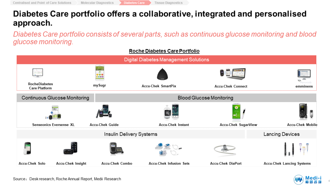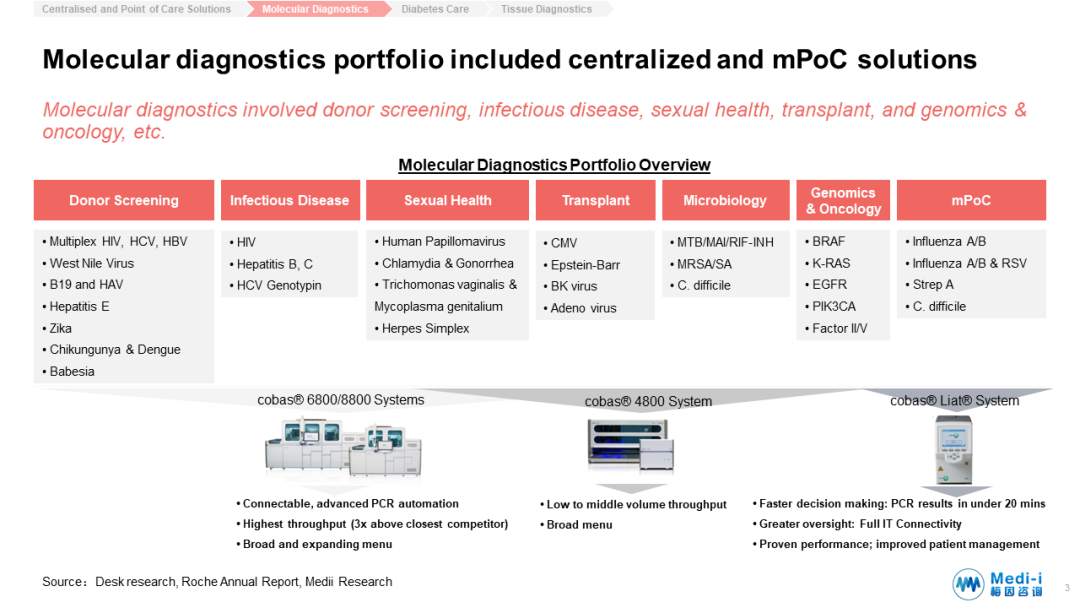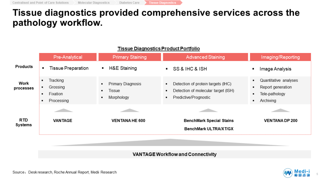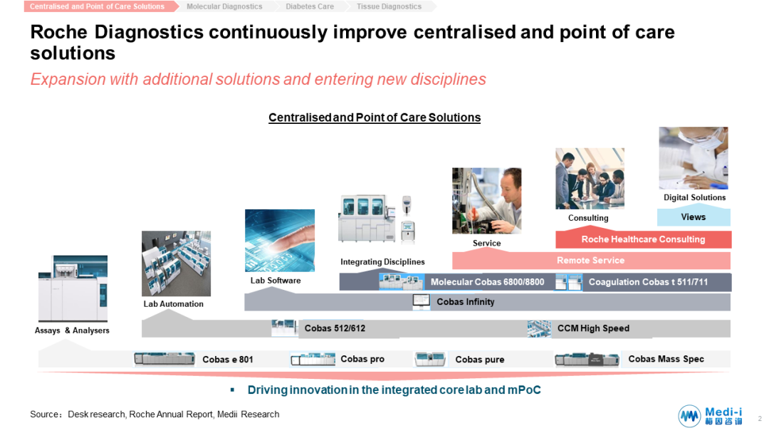 Roche diagnostics持续完善其中心实验室和POC诊断业务,迭代升级成为集试剂&分析仪、实验室自动化、实验室软件、POC产品、咨询服务及数字化于一体的综合服务商,驱动中心实验室和POC诊断业务稳步发展。 Roche diagnostics分子诊断业务向中心化和POC化均衡发展,以满足不同客户群体的需求。同时,分子诊断业务产品也从血液筛查、感染性疾病、性传播疾病逐步拓展至器官移植、肿瘤等领域。 Roche diagnostics糖尿病管理业务包括数字化管理解决方案、动态血糖监测、血糖监测以及胰岛素给药系统,但受限于欧洲、中东等地区的价格压力,其营业收入略有萎缩。 Roche diagnostics组织业务可提供基于组织病理流程的全面服务,包括样品制备、组织染色、显影及报告分析。 过去,Roche diagnostics best in临床生化、免疫诊断; 目前,Roche diagnostics best in 整合中心实验室业务; 未来,Roche diagnostics 将整合诊断信息,以期触手可及。