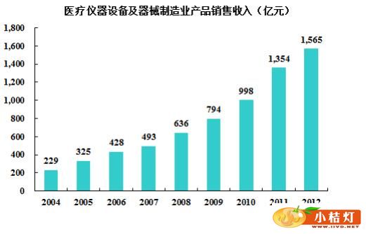 中国医疗器械行业发展概况分析 医疗器械行业的制造技术涉及临床医学、医药、机械、电子、塑料等多个技术交叉领域。我国医疗器械产业规模从小到大,发展迅速,现已发展为产品门类较为齐全、市场需求旺盛、产业链条完善、产业基础较为雄厚的朝阳产业,同时也是我国国民经济的基础产业、先导产业和支柱产业之一。2004年医疗仪器设备及器械制造业产品销售收入总计229亿元,而2012年则达到1,565亿元,年复合增长率为27.16%。