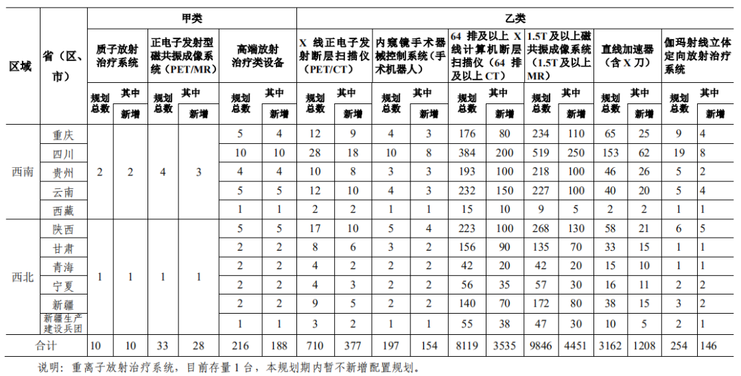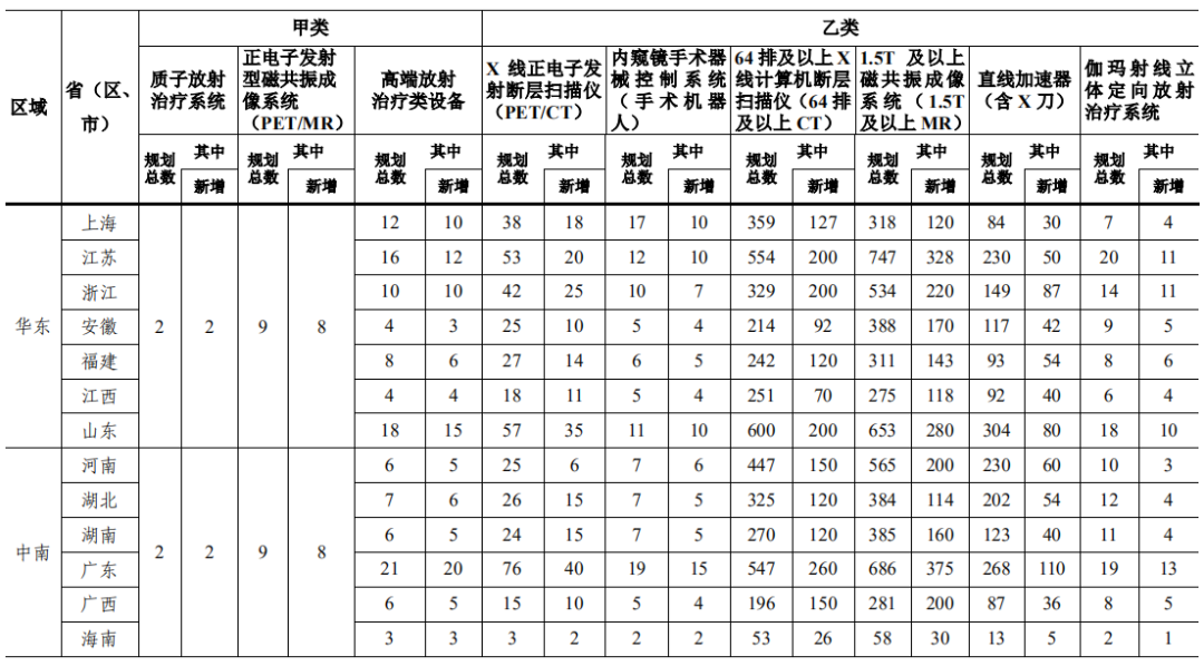 2020年7月31日,国家卫生健康委财务司发布《关于调整2018-2020年大型医用设备配置规划的通知》,在原规划的基础上,大幅度增加了全国范围内多地区的大型医疗器械配置规划。 2018年卫健委发布的《2018-2020大型医用设备配置规划》(详情查看《22,548台!卫健委发布大型医用设备配置规划!》)规定,截至2020年底,全国规划配置大型医用设备22,548台。调整后,2018-2020年甲乙类大型医用设备规划12768台,其中:甲类大型医用设备配置规划由226台增加到281台,乙类大型医用设备配置规划由10097台增加到12487台。重离子放射治疗系统、质子放射治疗系统、正电子发射型磁共振成像系统(英文简称PET/MR)、高端放射治疗设备、首次配置的整台(套)单价在3000万元人民币以上的大型医疗器械。重离子放射治疗系统:本规划期内暂不制订新增配置规划。质子治疗肿瘤系统:2018-2020年新增总数由10台调整为16台,较原来增长6台,同比增加60%,从数字来看,单台质子设备大概三到五亿RMB/台,增加6台的质子大概有20~30亿元的国家资金投入,其中,华北地区由2台增加到3台、东北地区由1台增加到2台、华东地区由2台增加到3台、中南地区由2台增加到4台、西南地区由2台增加到3台、西北地区仍为1台。正电子发射型磁共振成像系统(PET/MR):2018-2020年新增总数由28台调整为77台,较原来增长49台,同比增加175%,从数字来看,单台正电子设备大概四到五千万RMB/台,增加49台大概有20~30亿元的国家资金投入,其中规划总数分别为华北14台,东北8台,华东29台,中南21台,西南7台,西北3台。(由于历史原因造成的设备已购,但是配置证没有发的医疗机构,这次也会解决)高端放射治疗设备:2018-2020年新增总数不变,还是原来的188台,虽然总数量与调整前没有变化,但华北、东北、华东、中南、西南、西北六大区域及区域内省(区、市)所分配到的台数有所调整。乙类大型医用设备包括:X线正电子发射断层扫描仪(PET/CT)、内窥镜手术器械控制系统(手术机器人)、64排及以上X线计算机断层扫描仪(64排及以上CT)、1.5T及以上磁共振成像系统(1.5T及以上MR)、直线加速器(含X刀)、伽玛射线立体定向放射治疗系统。X线正电子发射断层扫描仪(PET/CT):2018-2020年新增总数由377台调整为551台,较原来增长174台,同比增加46.15%,从数字来看,单台X线正电子发射断层扫描仪设备大概两千万RMB/台,增加174台大概有20~30亿元的投入内窥镜手术器械控制系统(手术机器人):2018-2020年新增总数由154台调整为225台,较原来增长71台,同比增加46.10%,从数字来看,单台手术机器人设备大概两千万RMB/台,增加71台大概有10~20亿元的投入64排及以上X线计算机断层扫描仪(64排及以上CT):2018-2020年新增总数由3535台调整为4754台,较原来增长1219台,同比增加34.48%,从数字来看,平均单台64排及以上X线计算机断层扫描仪(64排及以上CT)设备平均单价是1000万-1500万RMB/台(还有很多256层以上超高端CT的需求),增加1219台高端CT大概有近200亿元的投入1.5T及以上磁共振成像系统(1.5T及以上MR):2018-2020年新增总数由4451台调整为5318台,较原来增长867台,同比增加19.48%,从数字来看,单台1.5T及以上磁共振成像系统设备单价为800-1000万RMB/台,增加867台大概有近100亿元的投入直线加速器(含X刀):2018-2020年新增总数由1208台调整为1451台,较原来增长243台,同比增加20.12%,从数字来看,单台直线加速器单价为两千万RMB/台,增加243台大概有40~50亿元的投入伽玛射线立体定向放射治疗系统:2018-2020年新增总数由146台调整为188台,较原来增长42台,同比增加28.77%,从数字来看,单台伽玛射线立体定向放射治疗系统单价为1000万到1500万RMB/台,增加42台大概有5-10亿元的投入附:2018-2020 年大型医用设备配置规划数量分布表(调整前后对比) 2018-2020年大型医用设备配置规划数量分布表(调整前)