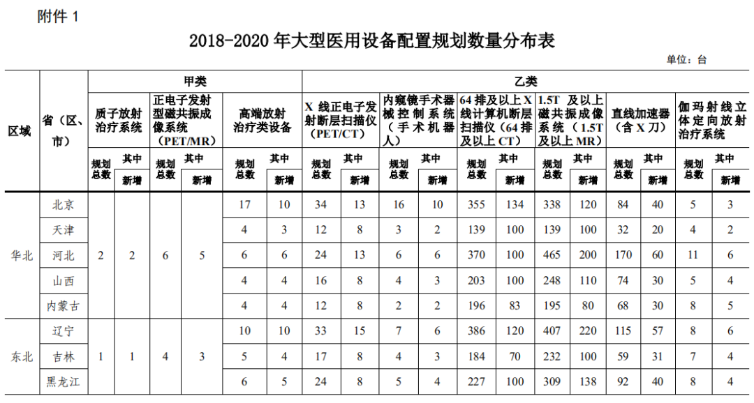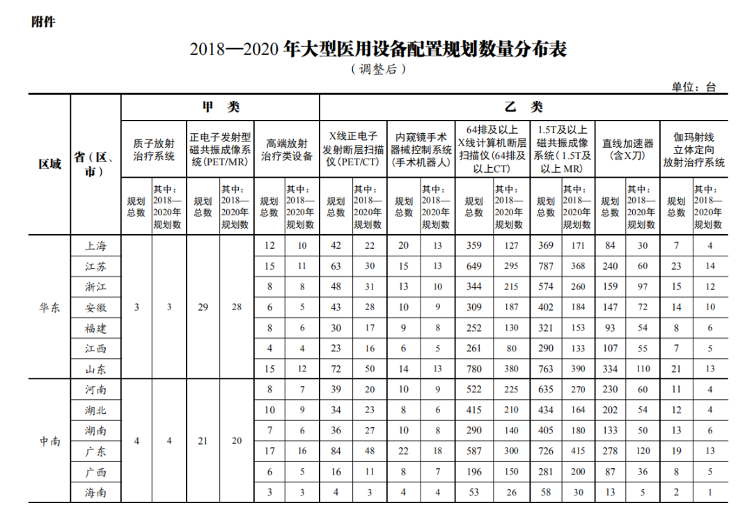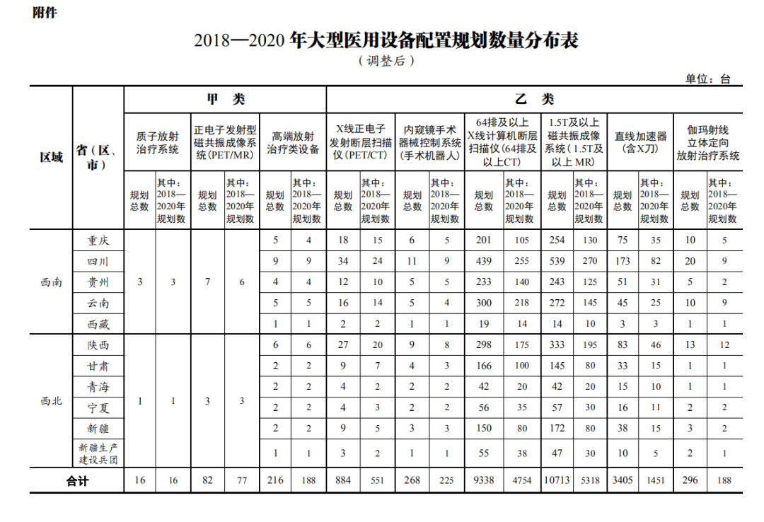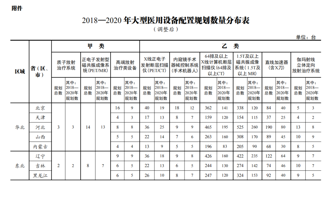 ▲2018-2020年大型医用设备配置规划数量分布表(调整前)(图片来自卫健委) 2018-2020年大型医用设备配置规划数量分布表(调整后)
