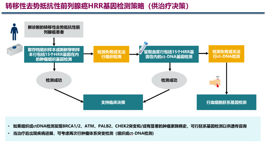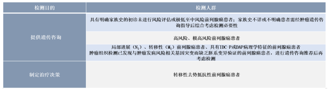 * 对于所有mCRPC患者,A类推荐行至少包含HRR基因胚系及体系变异的检测,并可以考虑行微卫星不稳定(MSI)和DNA错配修复缺陷(dMMR)检测。* 对明确家族史的未行风险评估或极低至中风险前列腺癌患者。* 局部进展或转移性前列腺癌患者、具有IDC-P或DAP病理学特征的前列腺癌患者。
