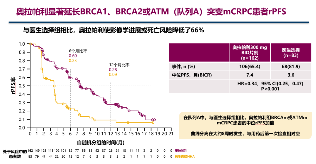 奥拉帕利的国际多中心三期临床研究PROfound研究显示,携带HRR基因突变的患者(特别是BRCA1/2和ATM)能够从奥拉帕利单药治疗中获益,其中BRCA1/2和ATM突变患者能够降低66%的影像学进展或死亡风险。