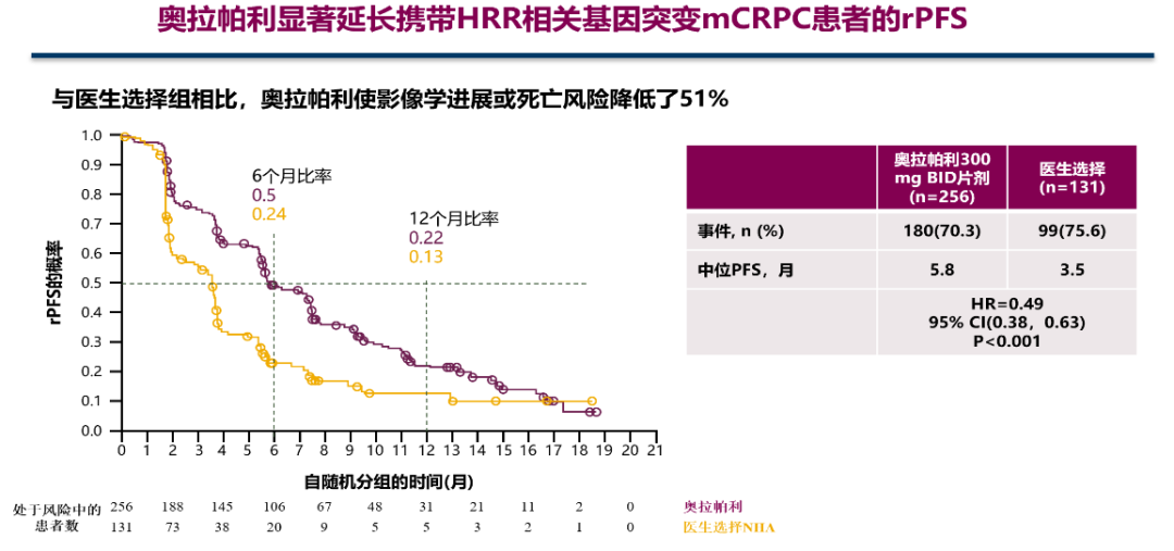 同时研究显示,奥拉帕利能够显著延长携带BRCA1/2、ATM、BARD1、BRIP1、CDK12、CHEK1、CHEK2、FANCL、PALB2、RAD51B、RAD51C、RAD51D和RAD54L等HRR基因突变患者的影像学无进展生存。