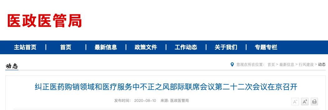 8月10日,国家卫健委医政医管局发布消息称,日前,纠正医药购销领域和医疗服务中不正之风部际联席会议第二十二次会议在北京召开。 国家卫健委主任马晓伟出席会议并讲话。国家市场监督管理总局、国家医保局有关负责同志、纠风部际联席机制成员单位有关同志出席会议。全国卫生健康系统及省级纠风机制成员单位负责同志等近3000人通过视频系统参加会议。会议要求,2020年纠风工作要继续严厉打击欺诈骗取医保基金行为,巩固医药流通领域纠风成效,坚决清理行业乱象,积极应对疫情防控风险点,确保各项工作取得实效。去年11月21日,国家卫健委办公厅发布《关于印发大型医院巡查工作方案(2019—2022年度)的通知》表示,按照国务院廉政工作会议和中央巡视工作新要求,决定开展新一轮医院巡查工作。 新一轮大型医院巡查,自2019年11月启动,于2022年6月底前完成。国家卫健委负责委属委管医院巡查工作,接受巡查的原则上为二级以上公立医院,每所医院巡查天数原则上不少于7天。方案要求,针对大型公立医院的巡查要围绕热点问题,重点巡查医疗卫生行风建设“九不准”落实情况。比如:是否有加强监管、杜绝医师在药品处方、医学检查、检验等医疗服务中实行开单提成的具体措施;是否存在医疗卫生技术人员违反规定私自采购、销售、使用药品、医疗器械、医用卫生材料等医药产品的问题;是否有对违反规定私自采购销售、使用药品、医疗器械、医用卫生材料等医药产品的人员的处理办法;是否对医院内部人员与医药相关企业间接触作出了细致具体、便于查验的管理办法。今年1月10日,2020年全国医疗管理工作会议召开,明确提出今年要在“树立风清气正的行业作风上狠下功夫”。有分析指出,随着疫情防控工作进入后期,各大医院的业务也在回暖,医院的门诊量开始回升,医疗服务领域的行风建设和医院巡查整改工作将步入正轨。 在疫情后期,国家卫健委多次就医药购销领域纠风工作发文。今年6月5日,国家卫健委、公安部等九部门对外发布《2020年纠正医药购销领域和医疗服务中不正之风工作要点》再次强调,严肃查处收取医药耗材企业回扣行为。根据《2020年纠正医药购销领域和医疗服务中不正之风专项治理工作要点任务分工表 》:10月底前,由国家市场监管总局牵头,国家卫健委、公安部配合,严厉打击医药企业与合同营销组织(CSO)企业串通,虚构费用套现以支付非法营销费用的违法行为。聚焦医药购销、医疗服务和“保健”市场等重点领域,加强反不正当竞争和广告监管执法,加大对商业贿赂、虚假宣传、违法广告等行为的查处力度。年底前,由国家卫健委牵头,各成员单位按照职责分工配合,规范医商合作交往途径。明确行业学协会、医疗机构与医药相关企业间行为底线,制定医务人员对外交往行为规范。严厉打击假借学术会议、科研协作、学术支持、捐赠资助进行利益输送的不当行为。年底前,由国家卫健委牵头、国家中医药局、国家医保局按照职责分别牵头,国家市场监管总局、公安部按照职责配合,严肃查处收取医药耗材企业回扣行为。开展打击医疗机构从业人员收取回扣专项治理,查处医疗机构及医务人员利用执业之便谋取不正当利益、收取回扣的行为。重点检查医疗机构从业人员接受药品、医疗器械、医用卫生材料等医药产品生产、经营企业或经销人员以各种名义、形式给予回扣的行为。