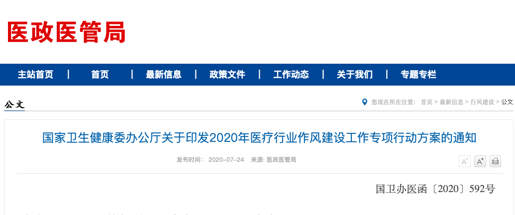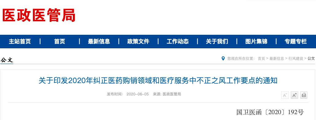 7月24日下午,国家卫健委办公厅发布的《关于印发2020年医疗行业作风建设工作专项行动方案的通知》再次明确,从今年7月开始直到年末,将重点整治医务人员收取回扣、药企违规营销等行为。