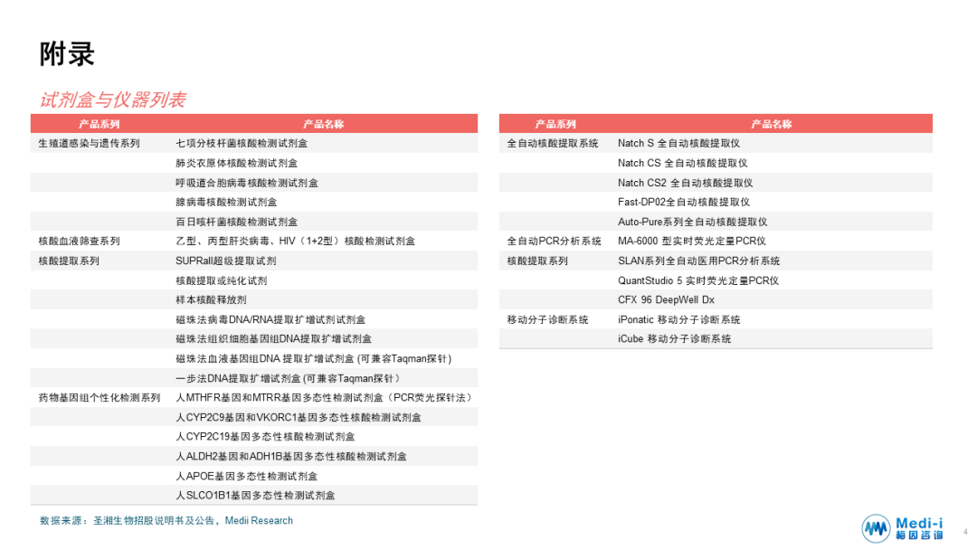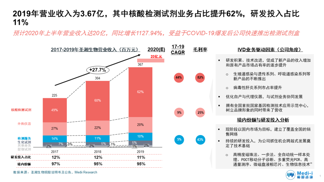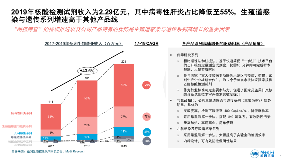 近日,圣湘生物基于实时荧光PCR技术的POCT产品iPonatic快速核酸检测系统获得国家药监局(NMPA)三类注册证;7月28日晚,圣湘生物科创板IPO获证监会核发批文,COVID-19影响下,圣湘生物无疑是2020年分子诊断领域最靓的仔。 2019年,公司实现营业收入仅为3.67亿元,预计2020年上半年年营业收入超20亿元,Medii Research认为这受益于COVID-19爆发后公司快速推出核酸检测试剂盒。而公司将其成功归因于:与其10余年技术沉淀积累、系统化的技术平台基础密不可分,包括样本处理、检测技术、自动化控制及集成、生物信息分析四大技术领域,涵盖“高精度磁珠法”、“一步法”、“全自动统一样本处理”、“POCT移动分子诊断”、“多重荧光PCR”、“高通量测序”、“微磁盘液相芯片”、“生物信息技术”等一系列核心技术。 病毒性肝炎产品系列为公司核心产品,但增速明显放缓,Medii Research认为这与病毒性肝炎产品成熟且竞争激烈不无关系;生殖道感染与遗传产品系列为公司培育的新增长点,Medii Research认为“两癌筛查”的持续推进以及公司产品特有的优势助力其高速增长。 |