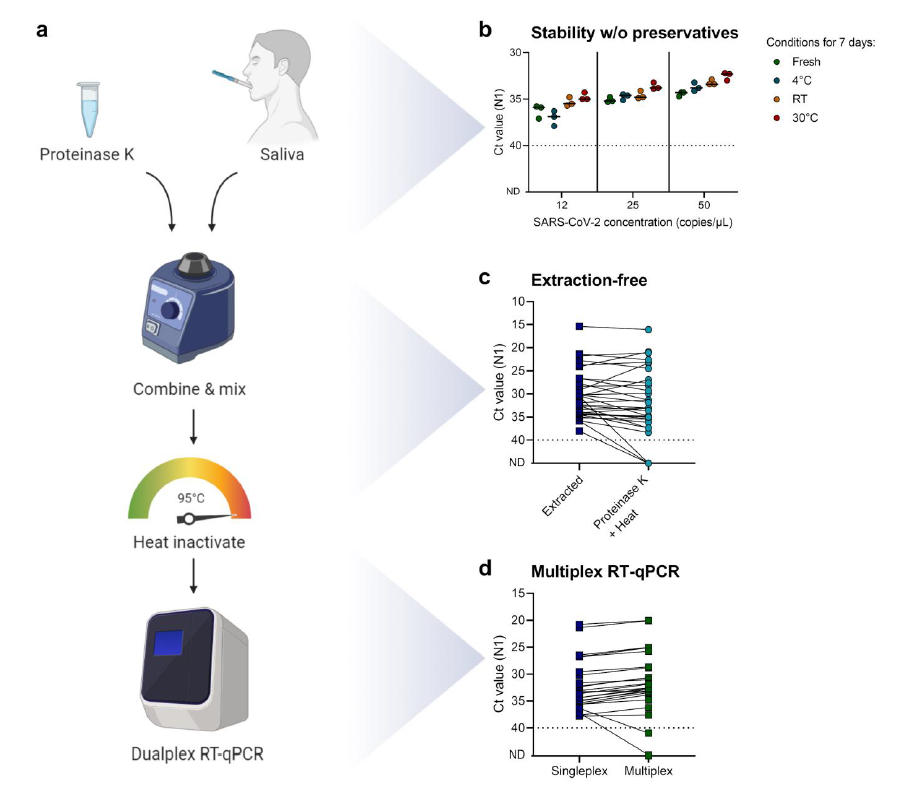 然后,研究人员进一步探索简化核酸检测流程的方法。他们将样本处理过程简化为将蛋白酶K(在DNA提取过程中常用的一种蛋白酶)加入样本中降解蛋白之后,直接将处理过的样本用于RT-PCR的检测流程,去除了从样本中纯化提取核酸的步骤。