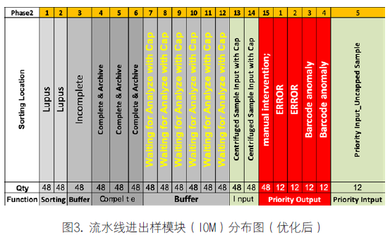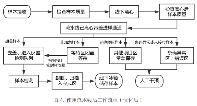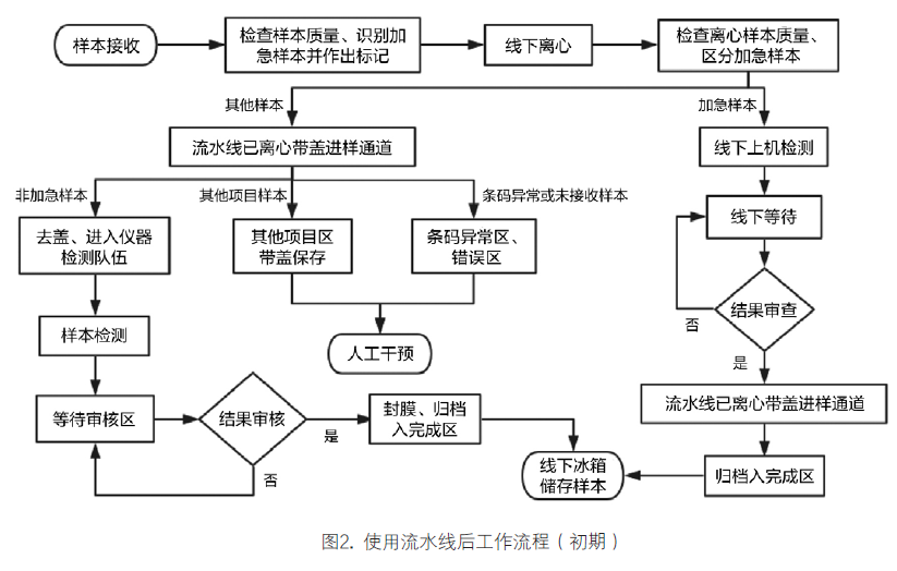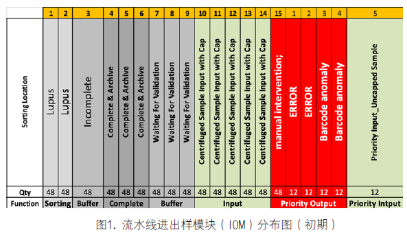 作者:刘丹 寿玮龄 吴卫 单位:中国医学科学院北京协和医院检验科 吴 卫 北京协和医院检验科临床基础检验专业组组长 副主任技师。北京协和医学院临床检验诊断学系临床血液和体液学检验教研室组长,CNAS医学实验室(ISO15189)评审员;中国研究型医院学会血栓与止血专业委员会委员;中国医学装备协会检验医学分会第二届临床检验装备学组委员;国家卫生计生委人才交流服务中心全国卫生人才评价领域专家;北京医学检验学会血液学和体液学检验分会常务委员;北京市临床检验中心临床血细胞检验诊断专家委员会委员;北京市血栓与止血检验质量控制专家委员委员,主持中国医学科学院创新工程1项(2018-I2MAI-002);作为PI主持临床试剂和仪器的注册工作20余项,在常规工作中积累丰富经验,以第一作者和通讯作者及参与发表文章50余篇。 血栓与止血筛查项目包括凝血酶原时间(prothrombin time,PT)、活化部分凝血活酶时间(activated partial thromboplastin time,APTT)、纤维蛋白原(fibrinogen,Fbg)、凝血酶时间(thrombin time,TT)、D-二聚体和纤维蛋白原降解产物(FDP),是评估机体出凝血状态最常用的临床指标,其检验结果的准确性、TAT都直接影响临床医疗决策、安全和诊疗效果。血栓与止血筛查项目对样本质量要求严格,样本采集时间、送检时间、样本采集量、是否存在凝块、离心条件、离心后血浆是否存在溶血、乳糜、黄疸、红细胞压积(HCT)是否≥55%等均会影响检测结果。目前多数实验室判断样本质量均靠人工判断,可能出现遗漏或受到主观因素的影响,判断出现偏差。本实验室尝试将LIS系统与实验室凝自动化系统有效结合,改进工作的流程,保证结果的质量。现将相关经验与大家分享。 血栓与止血筛选试验的全自动流水线系统于2018年8月份在实验室安装启用,图1为流水线进出样单元(I/OM)布局图,该单元包括5个已离心带盖进样区、3个检测后等待审核区、3个已完成检测归档区、1个未完成检测区、2个线下项目分类区、3个错误处理区、1个人工干预区和1个优先进样区。图2为血栓与止血实验室安装全自动流水线后的工作流程。 一、血栓与止血检测全自动流水线系统的优化 经过一段时间的使用,发现流水线存在一些需要优化的问题。 1. 高峰期样本从去盖到吸样时间间隔过长,导至样本血浆长时间暴露在空气中,一方面可能影响检测质量,另一方面增加了实验室生物安全风险。 2 . 流程中仍然有很多的繁复的人工操作,特别是手工分出急诊样本,因此在现有资源的基础上,仍有很大空间可以减少手工劳动强度、缩短样本的TAT。 3. 血栓与止血检测的样本有检测时间要求,流水线系统没有能有效的解决这个问题。针对以上问题,实验室在进行多次尝试与探索后,对流水线进行了如下优化:(1)重新配置了流水线进出样单元布局,如图3,将3个检测后等待审核通道改为3个闭盖等待检测通道,将5个已离心带盖进样通道减少为2个,余下3个改为闭盖等待检测通道;(2)在流水线软件中进行了针对性设置:① 将流水线上同时允许运行的最大样本数从90个改为48个,减少了样本去盖后再轨道上的等待时间;② 在分析仪侧轨的等待检测队列由原来的9个常规样本位置改为6个常规样本位置,保障了加急样本随时可以插入进行检测。 二、血栓与止血检测全自动流水线系统的优化后的优势 通过上述优化后,实现了凝血检测的智能化流程,解决了之前存在的问题: 1. 缩短了时间:通过优化大大缩短了样本开盖到吸样的时间间隔。 2. 实现了流水线自动识别加急样本并优先处理:所有离心后的样本通过流水线已离心带盖进样区上线,在条码识别后,急诊样本直接去盖并进入分析仪检测队列,常规样本进入等待区闭盖等待,流水线根据线上实时样本量进行去盖并进入分析仪检测队列等待检测,所有样本吸样完成后即线上封膜归档。狼疮、纠正试验等其他检测项目的样本(因为所用的采血管相同,不再人工进行分类,都进入流水线)则进入其他项目区后取出另行检测。条码异常、未接收样本、超时未检测样本等则会分拣到错误处理通道,人工进行干预解决,同时保留无盖优先进样通道保证了特殊加急样本的优先检测。 3. 实现了样本的“先进先出”:通过软件控制流水线按上线顺序将等待区样本依次抓入流水线进行检测;同时,因为样本等待时间过长会影响检测质量,因此针对上线3小时后仍然在等待检测的样本,软件自动将其升级为加急样本并优先检测,保障了样本的检测质量与TAT。 优化后流水线的工作流程如图4所示。上述优化提升了凝血检测的工作效率,减少了人工操作流程,避免人工错误的同时降低了实验室生物安全风险。 三、血栓与止血检测流水线与实验室LIS系统的优化创新 LIS系统在智能化实验室的构建中起着重要作用。为配合血栓与止血流水线的使用,对实验室LIS系统同样进行了优化与创新。 为方便工作, 实验室在LIS系统与流水线Centralink中间件软件检验数据传输的基础,实现了样本在线换机复查和取出(如图5);该功能实现后,实验室可在LIS端直接控制流水线进行标本查取,但目前复查机器的选择仍需在Centralink端进行,下阶段实验室将会对该功能进行进一步优化,实现在LIS端的一键换机复查。 血栓与出血筛查试验中,当患者HCT≥55%时,需要对采血管中抗凝剂的量进行调节,在LIS结果显示界面增加了该样本患者最近至少一次HCT结