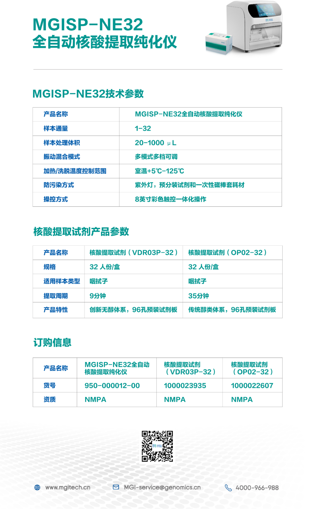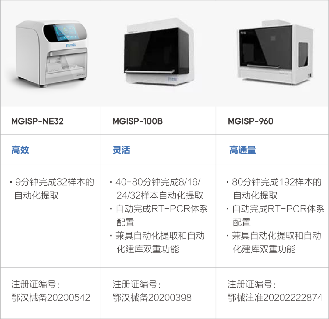 目前,MGISP-NE32及配套核酸提取试剂均已获批NMPA,自动化程度高、检测通量灵活,为中小通量样本检测提供了快速灵活的自动化解决方案。 MGISP-NE32及其配套的病毒核酸提取与纯化试剂盒,可用于病毒核酸提取与纯化及后续qPCR和测序等应用;未来会开发面向不同样本类型和更多应用领域的核酸提取与纯化方案。 MGISP系列自动化产品家族自2015年起投入研发,2017年正式发布,2018年起规模化量产并陆续获证,销往全球。作为全球火眼实验室的“标配”,MGISP系列自动化核酸提取仪支援了数百万例样本的新冠筛查,灵活高效、安全可靠,值得信赖。