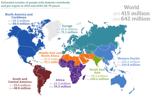 糖尿病是慢性渐进性的非传染性疾病,以血液内葡萄糖(血糖)水平不断升高为特征,其发生或是因为胰腺不能分泌足够的胰岛素来调整血糖,或是因为身体不能有效使用其所分泌的胰岛素。 01. 江湖背景:何为“大糖盛世” (摘自:Diabetes Atlas, 7th edition, IDF, 2015.)