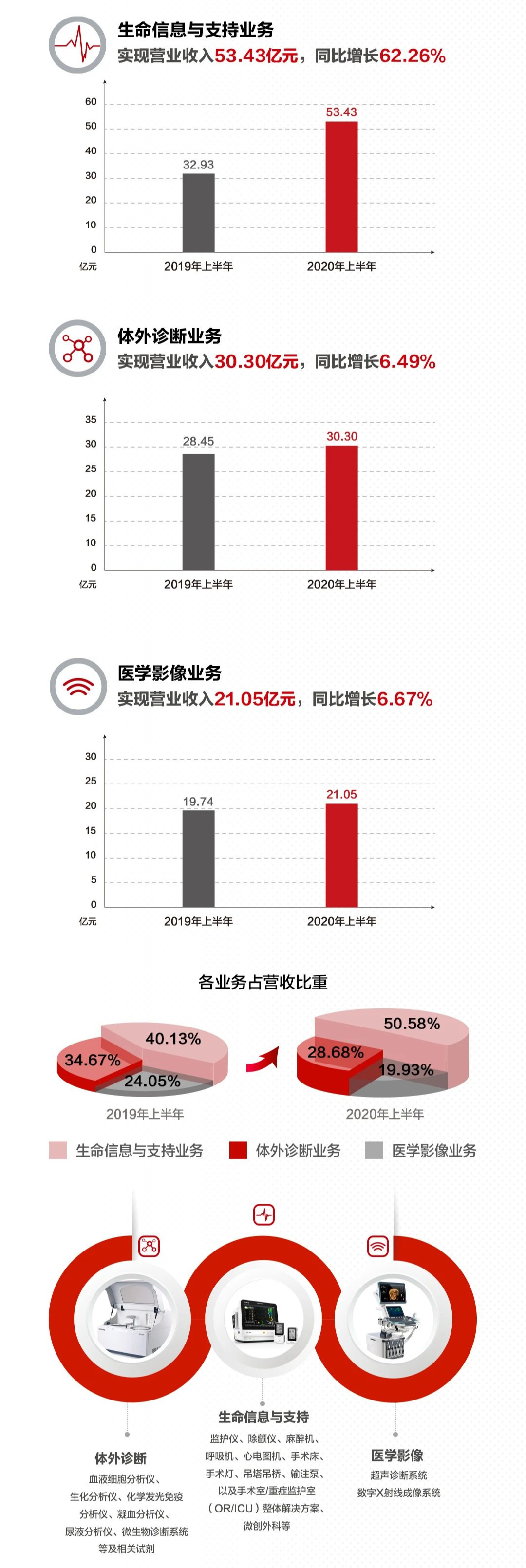 2020上半年公司整体业绩保持较快增长,主要受益于公司三大业务板块持续注重研发创新,分别在国内和国际市场进一步实现高端客户群突破。其中受新冠疫情的影响,公司生命信息与支持业务的监护仪、呼吸机、输注泵,医学影像业务的便携彩超、移动DR等和疫情直接相关的产品增长不同程度加速。其中,新冠疫情对生命信息与支持业务的拉动作用尤为显著。在生命信息与支持领域,报告期内公司实现营收53.43亿元,同比增长62.26%。作为疫情期间需求量较大的业务领域,生命信息与支持业务中的监护仪、呼吸机、输注泵以及瑞智联IT解决方案此次发挥了巨大的作用。体外诊断业务:实现收入30.30亿元,占总营收比28.68%,同比增长6.49%。常规诊断试剂销售受门诊量下滑影响有所承压,预计目前已基本恢复,上半年化学发光免疫分析仪装机量预计超过1000台,或带动试剂持续放量。Q2海外新冠抗体试剂需求大增,对冲了疫情对IVD业务的负面影响,预计下半年将持续受益于海外疫情对检测试剂的需求。医学影像业务:实现收入21.05亿元,占总营收比19.93%,同比增长6.67%。一季度彩超业务影响较大,但自3月起便携彩超和移动DR需求增加弥补了彩超销量下滑的影响,其中移动DR在国际市场品牌影响力得到提升,为开拓国际市场奠定基础。可以看到,体外诊断板块以及影像板块增长幅度并不大,疫情拉动了板块的其他产品的需求,所以使得体外诊断和医学影像业务整体只有小幅度的增加。随着国内市场的相关需求已经在逐步回归正常水平。预计后期这两大板块的业绩增长可能会相对乏力。在营收、利润保持增长的同时,迈瑞医疗在研发创新上也保持了惯有的高投入。2020年上半年,研发投入金额达到10.04亿元,同比增长29.06%。据了解,迈瑞已建立起基于全球资源配置的研发创新平台,设有八大研发中心,共有约2,500名研发工程师,分布在深圳、南京、北京、西安、成都、美国硅谷、美国新泽西和美国西雅图。报告期内,迈瑞的第九个研发中心——武汉研究院项目的建设工作进行顺利,拟成为迈瑞医疗的标杆研究院。公告显示,截至2020年6月30日,公司共计申请专利5,714件,其中发明专利4,038件;共计授权专利2,939件,其中发明专利授权1,486件。2020年上半年,迈瑞的ePM系列监护仪系统、MX系列高端便携超声系统及推车和HyLED X9手术灯均获得Red Dot和iF双项设计大奖;BeneHeart C系列自动体外除颤器获得Red Dot设计大奖。此外,公司研发与生产始终保持密切协同,以产品生命周期管理流程为核心,在导入新产品的研发过 程中,充分考虑生产的便捷性,优化产品设计,以提升生产效率和产品质量。公司不断加强制造能力的建 设与生产管理水平的提升,通过垂直整合、精益生产、智能制造等措施,建立健全先进的质量管理体系、 精益生产体系与智能制造体系。迈瑞凭借完善的生产管理体系,公司产品得到下游客户的广泛认可。 截至2020年6月30日,公司营销人员近3,300人。公司在国内超过30个省市自治区均设有分公司;在境 外超过30个国家拥有子公司,产品远销190多个国家及地区。公司已成为美国、英国、德国、法国等国家 的领先医疗机构的长期合作伙伴。报告期内,公司加大线上推广力度,持续优化销售渠道,提升经销商质 量,加强销售团队管理,完善销售和服务体系,提高运营效率,取得了良好的效果。 持续突破海内外高端客户群迈瑞表示,由于疫情影响而带来的需求量增加,公司的呼吸机、监护仪等抗疫设备大量进入了海内外全新高端客户群,大大缩短了公司品牌和产品的推广周期,通过产品核心竞争力的持续提升和本地化服务团队的日益完善,未来有望协同带动三大业务领域中的其他产品全面入院,提升公司整体产品在高端客户群的渗透率。在国内市场方面,迈瑞的产品持续被国内一流医疗机构接受,销售的产品已全面覆盖生命信息与支持、体外诊断、医学影像三大业务领域,同时实现从中低端到中高端、从科室到全院的整体化、集成化解决方案,特别在疫情后的补短板、医院改扩建以及战略储备项目中具备更大竞争优势。在国际市场方面,受益于过去的长期市场耕耘和品牌建设,迈瑞在疫情中凭借优质的质量和完善的服务,获取了大量的订单,加快了各国公立市场及高端客户群的突破。公司呼吸机及监护仪产品大范围进入海外高端医院,提升了客户层级,加强了客户关系,树立了可信赖、高质量的全球品牌形象,为后续持续的客户群突破打下了坚实的基础。2020年上半年,迈瑞医疗境外收入占比47.45%。在全球经济面临风险、政府财政压力加剧的背景下,迈瑞在三大核心业务之外,公司也在积极布局新兴板块,或成为未来新的业绩增长点。目前已经把目光瞄准微创手术器械市场。迈瑞医疗发布公告称,迈瑞医疗全球第二总部已在武汉开建,预计武汉生产基地项目及武汉研究院项目的总投资额不超过人民币45亿元,前者总投资额预计20亿元,后者总投资额预计不超过25亿元。值得注意的是,迈瑞医疗武汉生产基地项目建设内容包括骨科植入物及手术治疗设备制造、检验试剂制造、生物原材料制备、微创手术设备制造等。而微创手术器械被称为“毛利率超80%”的市场。相关资料也显示,到2024年,中国每百万人口接受微创外科手术的数量及微创外科手术的渗透率将分别增至18,242台及49.0%。迈瑞此举无疑会更加稳固自己“大哥大”