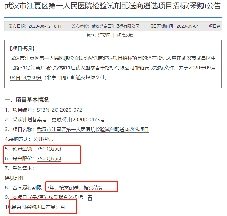 谈及“IVD国产化脚步”话题,进口与本土化企业的竞争成为行业者争论不休的沸点。 在全球贸易保护主义盛行,新冠突如其来,中国实行分级诊疗,5G、人工智能成为制造行业新业态等复杂的全球市场环境下,作为全球体外诊断第二大市场的中国开始了一场轰轰烈烈的变革,国产IVD企业开始重返本土市场,各地政府相继发文表示在一定条件下,优先采购国产IVD设备。一时间“国产崛起”、“国产替代”话题不绝于耳。同时,在激烈的大环境紧逼下,IVD外企陷入背腹受敌的局面。 7500万元采购只要国产IVD, 外企巨头究竟慌不慌? 近日,中国政府采购网发布一则《武汉市江夏区第一人民医院检验试剂配送商遴选项目招标(采购)公告》(一下简称《公告》)。《公告》表示本次预算金额为7500万元,服务周期为3年,明确不接受进口产品投标。 图源:中国政府采购网 无独有偶,8月24日,广东省财政厅发布《关于省政协十二届三次会议第20200567号提案答复的函》,其中关于支持国产大型医用设备推广应用的提案,经各等单位意见回复表示: