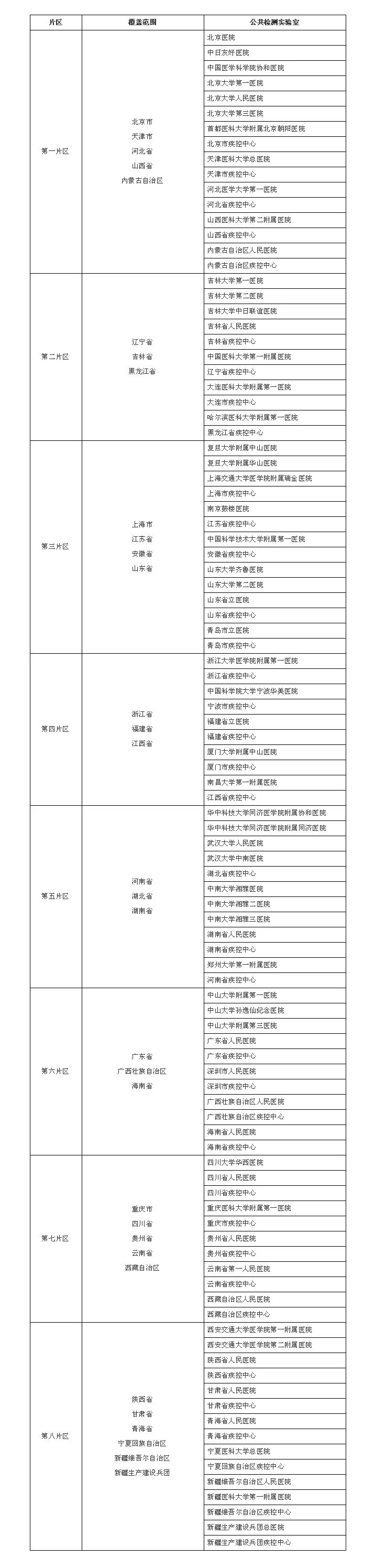 国务院应对新型冠状病毒感染肺炎疫情联防联控机制关于印发进一步推进新冠病毒核酸检测能力建设工作方案的通知 国办发明电〔2020〕22号 各省、自治区、直辖市人民政府,国务院各部委、各直属机构: 为落实党中央、国务院有关决策部署,做好新冠病毒核酸检测工作,现将《进一步推进新冠病毒核酸检测能力建设工作方案》印发给你们,请结合实际认真贯彻落实。 国务院应对新型冠状病毒感染肺炎疫情联防联控机制 2020年8月27日 进一步推进新冠病毒核酸检测能力建设工作方案 党中央、国务院多次对提高新冠病毒核酸检测能力作出部署。为落实国务院常务会议和国务院联防联控机制专题会议要求,进一步推进新冠病毒核酸检测能力建设,特制定本方案。 一、工作目标 到2020年9月底前,实现辖区内三级综合医院、传染病专科医院、各级疾控机构以及县域内至少1家县级医院具备核酸采样和检测能力。到2020年底前,所有二级综合医院具备核酸采样和检测能力,完成城市检测基地和公共检测实验室建设,充分发挥独立设置的医学检验实验室(以下称第三方实验室)作用,合理布局分区域机动核酸检测力量,形成快速反应的调集机制,具备在发生局部聚集性疫情时较短时间内完成人群核酸检测的能力。 二、工作任务 (一)提高日常核酸检测能力。二级以上综合医院、传染病专科医院、各级疾控机构以及县域内具备核酸检测能力的县级医院要充分利用现有资源,加快提升核酸检测能力,满足日常检测需要。各地按照地级以上城市城区每100万常住人口至少1家的标准和填平补齐的原则,依托三级综合医院建设城市检测基地,城区常住人口低于100万的至少建设1家。城市检测基地检测能力应达到1万份/天(份按单样检测计算,人份按混样检测计算),发生疫情时通过增加班次达到3万份/天。城市检测基地原则上仅承担所在城市的工作任务,保障零星散发疫情核酸检测需要。要加强口岸快速核酸检测和货物消毒检测能力建设,提高通关便利度。 (二)建设机动核酸检测力量。 1.建设公共检测实验室。综合各地医疗卫生资源布局和地理交通等因素,在全国选取100家大型公立医院、疾控中心建设公共检测实验室。充分利用现有资源,坚持“平战结合、填平补齐”的原则,每个公共检测实验室要具备1万份/天的检测能力,配备移动方舱实验室(移动生物安全二级实验室)及相关辅助移动设施,全国形成100万份/天的机动检测储备能力。建设工作由所在省份组织实施。 2.组织购买第三方实验室核酸检测服务。各地要积极采取措施,引导、推动第三方实验室依法依规健康发展。发生疫情时,按照下设实验室较多、分布较广、检测能力较强、资源调动效率较高等标准和自愿参加的原则,通过政府购买服务的方式组织第三方实验室参与核酸检测。地方与第三方实验室签订购买服务协议,明确检测量、完成时限、检测费用等,并约定其他有关事项。 (三)建立片区机动支援制度。综合人口、医疗卫生资源布局及地理交通等因素,将全国划分为8个片区,统筹片区内公共检测实验室、较大规模的第三方实验室等作为机动检测队伍,每个片区形成50万—70万份/天的机动核酸检测能力。全国各片区划分及公共检测实验室配置情况见附件。 有关地方发生疫情需要进行核酸检测筛查时,原则上应依托本地区、本省份检测力量,检测能力确有不足需要支援时,要向国务院联防联控机制综合组提出申请。具体支援工作由国家卫生健康委统筹协调,从片区内调动机动检测队伍进行支援,片区内力量不足或本片区调动不便时从临近片区调动支援。公共检测实验室相关人员交通、食宿及检测费用等由受援地方负责。 派出的机动检测队伍检测能力按照以下目标确定,实现5—7天基本完成全员核酸检测工作:检测人数在500万以下的,日检测量通过混样检测达到50万—100万人份;检测人数在500万至1000万的,达到100万—150万人份;检测人数在1000万以上的,达到150万人份以上。 (四)加强检测人员队伍建设。各地要根据检测实验室规模配备足够的检测人员,建立后备人员梯队。要制定操作性强的细化培训方案,组织对医疗机构、疾控中心和第三方实验室检测人员开展相关培训。要于2020年9月底前完成目前在岗技术人员的培训,新建扩建实验室增加的技术人员要在实验室建成时完成培训,做到机构和人员同时到位。要充分组织调动现有医疗卫生人员,各检测实验室建设单位要优化内部人员配置,并根据检测工作需要配备足够的采样人员。 (五)建立核酸检测资源信息管理系统。国家卫生健康委在目前核酸检测信息平台基础上,将具备核酸检测能力的各类检测机构有关信息纳入,形成核酸检测机构目录。同时,对各医疗机构、疾控中心、第三方实验室的采样、检测人员信息进行汇总,建立采样检测人员数据库。核酸检测机构目录和采样检测人员数据库实行动态管理,各级卫生健康行政部门和有关机构、人员根据相应权限掌握和管理。 三、工作要求 (一)加大政策资金支持保障力度。各地要加大配套政策和资金支持力度,保障相关实验室基础设施建设、设备配置等。要切实优化调整财政支出结构,统筹用好中央预算内投资、抗疫特别国债、地方政府专项债券、地方财政资金等多种渠道资金。允许疾控中心开展核酸检测时参照公立医院收费标