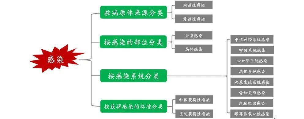 (二)病原微生物与感染 感染:病原微生物突破宿主的抵御功能,侵入机体,与机体相互作用相互斗争,导至机体产生临床症状、体征或生理功能异常。 病原微生物引起的疾病称为感染性疾病;部分感染性疾病能在人与人、动物与动物或人与动物之间相互传播,称为传染性疾病。 根据机体的免疫状态及病原微生物的毒力、数量等不同,可以出现以下结局:病原清除、隐形感染、显性感染、潜伏性感染和病原携带。 外源性感染:指由一般健康人体不携带的外界病原微生物进入正常的人体组织,与宿主相互作用相互斗争的过程。 此类病原微生物如炭疽杆菌、结核分枝杆菌、脑膜炎奈瑟菌、白喉棒状杆菌、痢疾志贺菌、甲乙丙肝炎病毒、新型冠状病毒等。 内源性感染:当机体抵抗力降低时,原来正常寄居或致病力很弱的微生物可能侵入人体其他易感部位造成的感染。 此类病原微生物通常成为条件致病菌,包括环境中通常不致病的细菌、人类正常菌群的异位和人类正常菌群的失调。如大量、长期使用广谱抗菌药物会杀灭大量正常菌群,耐药的致病菌和低致病度的病原菌大量繁殖生长,会造成菌群失调。肠道上的大肠杆菌转移到呼吸道会引起肺炎、转移到尿道会引起尿路感染,口腔中的甲型链球菌进入血液会引起菌血症。 还可以根据感染部位、感染身体的系统、感染环境来源等进行如下分类:
