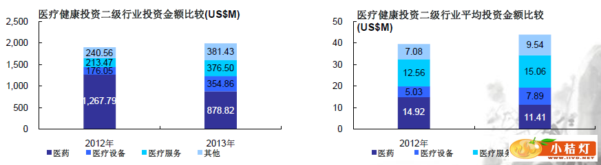 健康产业是当下的一个朝阳产业,已同TMT已成为PE/VC投资最为活跃的两个领域。根据清科研究中心统计数据显示,2013年VC/PE共投资了210家医疗健康企业,为2008年以来最高。投资金额总计19.9亿美元,仅低于“全民PE”火热的2011年。2013年医药投资涉及企业大概80多家,医疗设备50多家,医疗服务是29家,其他有12家。其中,医疗服务的投资是呈现快速增长,2013年已经有29家医疗服务企业获得融资。