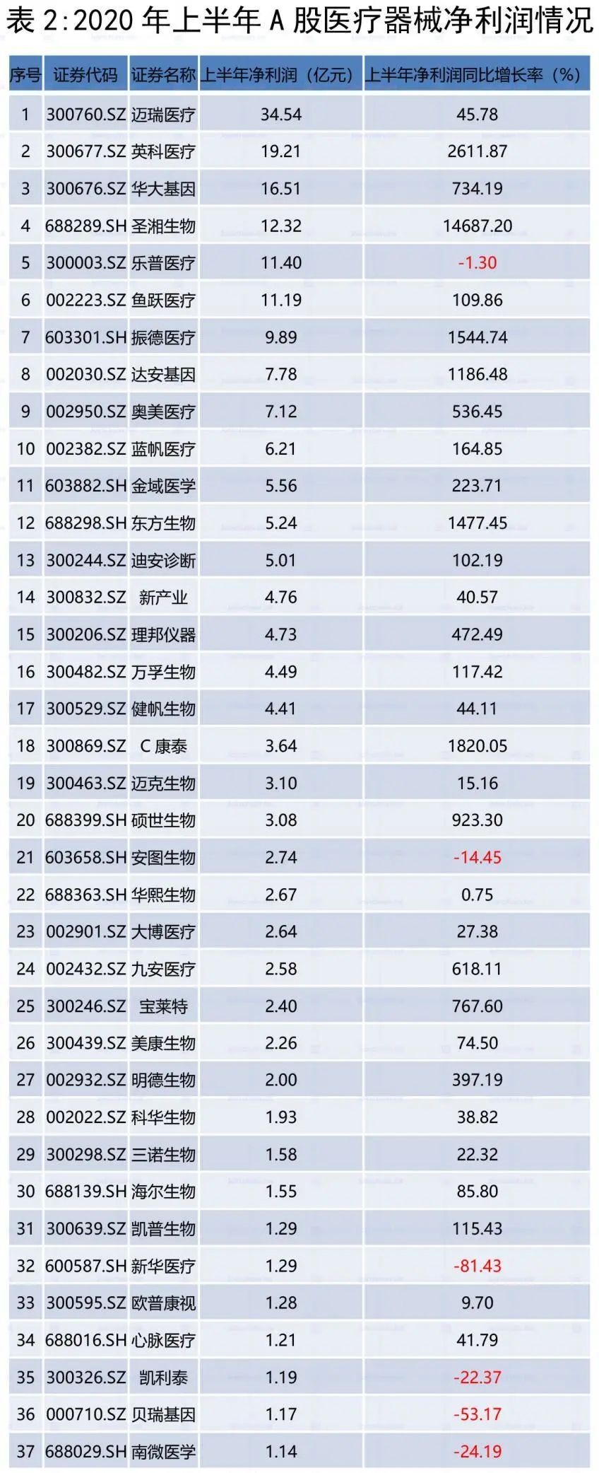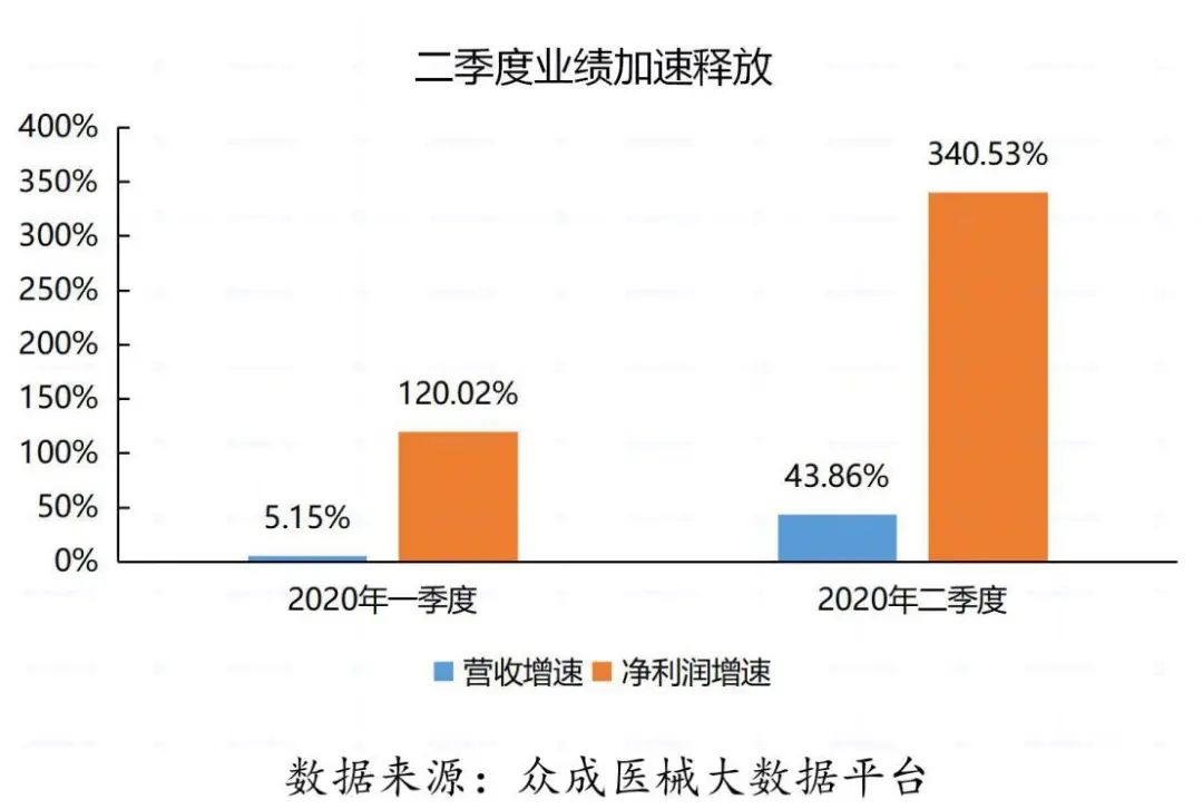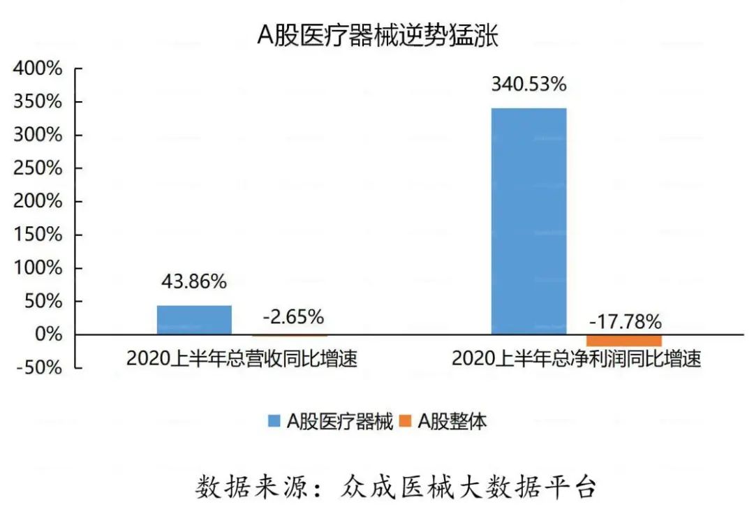 2020年上半年受全球疫情蔓延带来的冲击影响,A股上市公司业绩整体出现下滑,然而,医疗器械等抗疫股却逆势上涨。根据众成医械大数据平台统计,截至2020年8月31日,国内71家A股医疗器械企业年中报收官。71家上市公司实现总营收835亿元,同比增长43.9%;总净利润226.6亿元,同比增长340.5%。 一、A股医疗器械逆势领涨,二季度业绩加速释放 从增长率看,A股医疗器械企业与A股整体企业的营收表现形成极大反差。 受疫情影响,截至2020年8月31日,已披露年中报的3972家上市公司实现总营收23.52万亿元,同比下降2.65%;合计实现净利润1.85万亿元,同比下降17.78%。相比之下,受益于疫情期间医疗物资需求猛增,医疗器械板块逆势暴涨,71家医械企业总营收同比增长43.86%,总净利润同比增长340.53%。 分季度看,2020年A股医疗器械企业总营收一季度同比增长5.15%,二季度同比增长43.86%;总净利润一季度同比增长120.02%,二季度同比增长率高达340.53%。 主要原因是:一方面,二季度全球疫情持续爆发,尤其是海外医用口罩、手套等防护物资,核酸/抗体试剂盒、检测仪器等检测物资以及DR 机、呼吸机等医疗设备需求快速增长,业绩保持高位增速。另一方面,非新冠相关产品也随着国内二季度疫情缓解而恢复生产销售。 二、迈瑞医疗营收突破百亿,圣湘生物净利增速近147倍 在营收规模上,71家A股医疗器械企业梯度分化明显。 迈瑞医疗以105亿元的营收位居首位,稳居国内医疗器械企业第一梯队。以迪安诊断、英科医疗、乐普医疗、华大基因和新华医疗等8家企业为代表的第二梯队,营收居于40至50亿元之间;以以振德医疗、金域医学和鱼跃医疗等3家企业为代表的第三梯队,营收居于30至40亿元之间。以蓝帆医疗、奥美医疗、达安基因和圣湘生物等4家企业为代表的第四梯队,营收居于20至30亿元之间。 2020年上半年共有21家企业营收在10亿元以上。 数据来源:众成医械大数据平台 在营收增速上,71家A股医疗器械企业中有超过6成企业实现正增长,行业平均增速达72.6%。 其中,圣湘生物营收增速最快,高达1159.4%;爱博医疗、金域医学营收增速超过4.00%,东方生物、英科医疗增速超过300%;健帆生物、硕世生物等7家企业增速超过100%。此外,有25家企业营收出现同比下滑。 在净利润规模上,迈瑞医疗继续领跑国内医疗器械市场,以34.54亿元的净利润稳居榜首;英科医疗、华大基因分列二三,净利润分别达到19.21亿元和16.51亿元;圣湘生物、乐普医疗和鱼跃医疗3家企业净利润也均在10亿元以上。此外,有4家企业净利润出现亏损。 数据来源:众成医械大数据平台 在净利润增速上,71家企业中超70%实现正增长,其中圣湘生物同比增长14687.2%,表现最为亮眼;英科医疗同比增长2611.9%,仅次于圣湘生物;康泰医疗、振德医疗、东方生物、达安基因同比增长超过1000%;九安医疗上半年扭亏为盈,同比增长618.1%。 此外,有21家企业净利出现同比下滑。 三、总研发费用增长近30%,天智航研发占比领跑A股市场 从行业整体看,2020年上半年总研发投入45.70亿元,同比增长29.32%。从企业来看,上半年迈瑞医疗以9亿元稳居第一,乐普医疗以2.9亿排名第二,鱼跃医疗、金域医学、华大基因、万孚生物、安图生物、迪安诊断、开立医疗和蓝帆医疗研发费用也均突破1亿元;在研发强度(研发费用占营业收入的比例)方面,天智航高达65.05%,在A股市场独占鳌头,此外赛诺医疗、开立医疗、透景生命、祥生医疗研发强度也均超过20%。 数据来源:众成医械大数据平台 四、典型企业盘点 //1、迈瑞医疗稳健依旧强者恒强 迈瑞医疗2020年上半年实现营收105.64亿元,同比增长28.75%,其中境外收入占比47.45%;实现归母净利润34.54亿元,同比增长45.78%。迈瑞主要产品覆盖三大领域:生命信息与支持、体外诊断以及医学影像,拥有国内同行业中最全的产品线。其中,生命信息与支持业务的监护仪、呼吸机、输注泵和医学影像业务的便携彩超、移动DR在此次抗疫中发挥了极大的作用,体外诊断业务的新冠抗体试剂也在今年第二季度开始向海外市场出口。 //2、鱼跃医疗经营现金流半年超四年 鱼跃医疗上半年实现营收34.21亿元,同比增长36.74%;归母净利润11.19亿,同比增长109.86%。今年上半年,受到海内外疫情拉动的产品主要有无创呼吸机等呼吸类、红外额温枪、血氧仪等检测类与消毒感控类疫情防控产品。从国内外收入来看,国内收入23.7亿元(+13%),出口收入爆发式增长,达到10.2亿(+173%),出口占比从15%提高到30%。2020年上半年,鱼跃医疗录得经营性现金净流入23.7亿元,是2016年至2019年四年经营性净现金流之和。 //3、英科医疗盈利接近过去七年总和的3倍 英科医疗科技股份有限公司(以下简称“英科医疗”)成立于2009年,致力于医疗器械耗材研发、生产与营销。受新型冠状病毒疫情影响,全球一次性防护手套需求激增,英科医疗一次性防护手套产品售价有较大增长,使得销售收入和毛利率均有所提升。英科医疗上半年归母净利润为19.21亿元,同比增长2611.87%。根据公司财报,英科医疗在2013年至2019年整整七年内,公司总计实现盈利7.17亿元。而仅仅今年上半年,公司的盈利规模就达到过去七年总和的接近3倍。疫情爆发之后,公司又陆续公告拟在安徽和江西等地投资建设多个高端医用手套扩产项目,加速产能扩张,向全球一次性手套龙头企业迈进。 //4、振德医疗领跑口罩概念股 振德医疗用品股份有限公司(以下简称