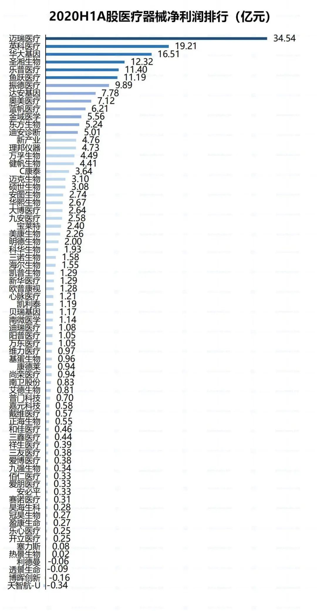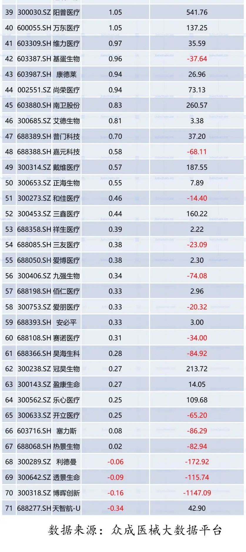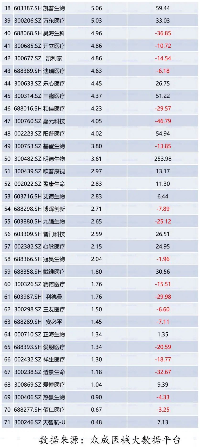 2020年上半年受全球疫情蔓延带来的冲击影响,A股上市公司业绩整体出现下滑,然而,医疗器械等抗疫股却逆势上涨。根据众成医械大数据平台统计,截至2020年8月31日,国内71家A股医疗器械企业年中报收官。71家上市公司实现总营收835亿元,同比增长43.9%;总净利润226.6亿元,同比增长340.5%。 一、A股医疗器械逆势领涨,二季度业绩加速释放 从增长率看,A股医疗器械企业与A股整体企业的营收表现形成极大反差。 受疫情影响,截至2020年8月31日,已披露年中报的3972家上市公司实现总营收23.52万亿元,同比下降2.65%;合计实现净利润1.85万亿元,同比下降17.78%。相比之下,受益于疫情期间医疗物资需求猛增,医疗器械板块逆势暴涨,71家医械企业总营收同比增长43.86%,总净利润同比增长340.53%。 分季度看,2020年A股医疗器械企业总营收一季度同比增长5.15%,二季度同比增长43.86%;总净利润一季度同比增长120.02%,二季度同比增长率高达340.53%。 主要原因是:一方面,二季度全球疫情持续爆发,尤其是海外医用口罩、手套等防护物资,核酸/抗体试剂盒、检测仪器等检测物资以及DR 机、呼吸机等医疗设备需求快速增长,业绩保持高位增速。另一方面,非新冠相关产品也随着国内二季度疫情缓解而恢复生产销售。 二、迈瑞医疗营收突破百亿,圣湘生物净利增速近147倍 在营收规模上,71家A股医疗器械企业梯度分化明显。 迈瑞医疗以105亿元的营收位居首位,稳居国内医疗器械企业第一梯队。以迪安诊断、英科医疗、乐普医疗、华大基因和新华医疗等8家企业为代表的第二梯队,营收居于40至50亿元之间;以以振德医疗、金域医学和鱼跃医疗等3家企业为代表的第三梯队,营收居于30至40亿元之间。以蓝帆医疗、奥美医疗、达安基因和圣湘生物等4家企业为代表的第四梯队,营收居于20至30亿元之间。 2020年上半年共有21家企业营收在10亿元以上。 数据来源:众成医械大数据平台 在营收增速上,71家A股医疗器械企业中有超过6成企业实现正增长,行业平均增速达72.6%。 其中,圣湘生物营收增速最快,高达1159.4%;爱博医疗、金域医学营收增速超过4.00%,东方生物、英科医疗增速超过300%;健帆生物、硕世生物等7家企业增速超过100%。此外,有25家企业营收出现同比下滑。 在净利润规模上,迈瑞医疗继续领跑国内医疗器械市场,以34.54亿元的净利润稳居榜首;英科医疗、华大基因分列二三,净利润分别达到19.21亿元和16.51亿元;圣湘生物、乐普医疗和鱼跃医疗3家企业净利润也均在10亿元以上。此外,有4家企业净利润出现亏损。 数据来源:众成医械大数据平台 在净利润增速上,71家企业中超70%实现正增长,其中圣湘生物同比增长14687.2%,表现最为亮眼;英科医疗同比增长2611.9%,仅次于圣湘生物;康泰医疗、振德医疗、东方生物、达安基因同比增长超过1000%;九安医疗上半年扭亏为盈,同比增长618.1%。 此外,有21家企业净利出现同比下滑。 三、总研发费用增长近30%,天智航研发占比领跑A股市场 从行业整体看,2020年上半年总研发投入45.70亿元,同比增长29.32%。从企业来看,上半年迈瑞医疗以9亿元稳居第一,乐普医疗以2.9亿排名第二,鱼跃医疗、金域医学、华大基因、万孚生物、安图生物、迪安诊断、开立医疗和蓝帆医疗研发费用也均突破1亿元;在研发强度(研发费用占营业收入的比例)方面,天智航高达65.05%,在A股市场独占鳌头,此外赛诺医疗、开立医疗、透景生命、祥生医疗研发强度也均超过20%。 数据来源:众成医械大数据平台 四、典型企业盘点 //1、迈瑞医疗稳健依旧强者恒强 迈瑞医疗2020年上半年实现营收105.64亿元,同比增长28.75%,其中境外收入占比47.45%;实现归母净利润34.54亿元,同比增长45.78%。迈瑞主要产品覆盖三大领域:生命信息与支持、体外诊断以及医学影像,拥有国内同行业中最全的产品线。其中,生命信息与支持业务的监护仪、呼吸机、输注泵和医学影像业务的便携彩超、移动DR在此次抗疫中发挥了极大的作用,体外诊断业务的新冠抗体试剂也在今年第二季度开始向海外市场出口。 //2、鱼跃医疗经营现金流半年超四年 鱼跃医疗上半年实现营收34.21亿元,同比增长36.74%;归母净利润11.19亿,同比增长109.86%。今年上半年,受到海内外疫情拉动的产品主要有无创呼吸机等呼吸类、红外额温枪、血氧仪等检测类与消毒感控类疫情防控产品。从国内外收入来看,国内收入23.7亿元(+13%),出口收入爆发式增长,达到10.2亿(+173%),出口占比从15%提高到30%。2020年上半年,鱼跃医疗录得经营性现金净流入23.7亿元,是2016年至2019年四年经营性净现金流之和。 //3、英科医疗盈利接近过去七年总和的3倍 英科医疗科技股份有限公司(以下简称“英科医疗”)成立于2009年,致力于医疗器械耗材研发、生产与营销。受新型冠状病毒疫情影响,全球一次性防护手套需求激增,英科医疗一次性防护手套产品售价有较大增长,使得销售收入和毛利率均有所提升。英科医疗上半年归母净利润为19.21亿元,同比增长2611.87%。根据公司财报,英科医疗在2013年至2019年整整七年内,公司总计实现盈利7.17亿元。而仅仅今年上半年,公司的盈利规模就达到过去七年总和的接近3倍。疫情爆发之后,公司又陆续公告拟在安徽和江西等地投资建设多个高端医用手套扩产项目,加速产能扩张,向全球一次性手套龙头企业迈进。 //4、振德医疗领跑口罩概念股 振德医疗用品股份有限公司(以下简称