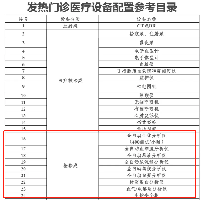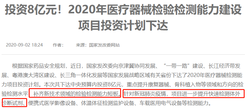 来源:国家发改委 / 赛柏蓝器械 整理:小桔灯网 图 源:中国医药报 9月2日,国家发改委发布消息:根据国家药品安全规划,发改委向京津冀协同发展、“一带一路”建设、长江经济带发展、粤港澳大湾区建设、长三角一体化发展等国家发展战略区域有关省份下达了2020年医疗器械检测能力项目投资计划。 划重点!划重点!划重点! 1:本次共下达中央预算内投资8亿元,重点提升康复器械、骨科植入物等领域和方向的检验检测水平,补齐新技术领域的检验检测能力短板。 2:资金使用覆盖在“长三江发展区”、“粤港澳大湾区”、“一带一路建设区”等21个省份的医疗产业。 3:针对新冠肺炎疫情,项目进一步提升快速检测体外诊断试剂、便携式医学影像设备、体温体征检测监护设备、车载医用电气设备等检测能力。 卫健委:全国配备IVD产品! 值得一提的是,仅在8月31日,国家卫健委规划发展与信息化司就表示要在全国发热门诊配备IVD设备,并下发了相关文件—《发热门诊建筑装备技术导则(试行)》(下称《技术导则》)。 图源:赛柏蓝器械 除了国家卫健委,今年7月,北京市卫健委发布《关于加快推进我市医疗机构发热门诊建设改造有关工作的通知》,同样明确发热门诊实验室的建设标准要求和相关IVD仪器设备的配置。 上述通知显示,发热门诊临床实验室开展的检验项目包括: