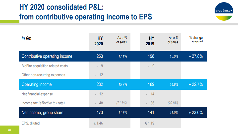 图片来源:梅里埃官网 在今年上半年,其临床应用销售额增长了19%,达到12.6亿欧元,而2019年上半年为10.6亿欧元。该公司的工业应用销售额为2.188亿欧元,较2.183亿欧元略有增长。 在临床应用中,生物梅里埃分子生物学产品的销售额在上半年达到了5.573亿欧元,比2019年上半年的3.263亿欧元增长了69%。微生物产品的销售额为4.604亿欧元,去年同期为4.845亿欧元。在2019年上半年,下降了4%。免疫分析的销售额从2019年上半年的2.292亿欧元下降14%,至1.95亿欧元。其他产品系列的销售额从2019年上半年的1,670万欧元急剧上升至2020年上半年的4,470万欧元。 梅里埃在一份声明中表示,该公司Biofire Filmarray产品线在第二季度有“明显增长”。并补充道,到6月底,Biofire仪器的安装基数增加到14,000台,而2019年底为10,400台。 图片来源:梅里埃官网 梅里埃指出,其微生物学业务受到“所有产品线试剂销售量下降的影响,这归因于医院就诊人数的下降,而该季度设备销售额急剧上升。” 按地区划分,第二季度梅里埃在美洲的销售额同比增长28%,从2.857亿欧元增长至3.647亿欧元,这是由FilmArray销售额推动的。欧洲,中东和非洲同比下降3%,而亚太地区的销售额下降6%。 梅里埃的净收入在2020年上半年跃升至1.73亿欧元,即每股1.46欧元,去年同期为1.41亿欧元,即每股1.19欧元。 图片来源:梅里埃官网 2020年上半年的研发费用从2019年上半年的1.79亿欧元跃升至2.03亿欧元,而2020年上半年的SG&A支出为3.82亿欧元。 梅里埃表示,由于新冠病毒大流行带来的不确定性,因此不会发布新的年度指导,但“基于上半年强劲的业绩和业务增长,预计第二季度财务业绩将非常可观。” 本文为翻译稿件,原文来源: https://www.genomeweb.com/business-news/biom-rieux-posts-16-percent-sales-growth-first-half-2020#.X1Xf_jMTDuw |