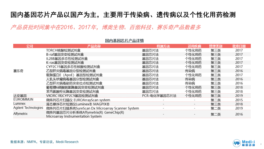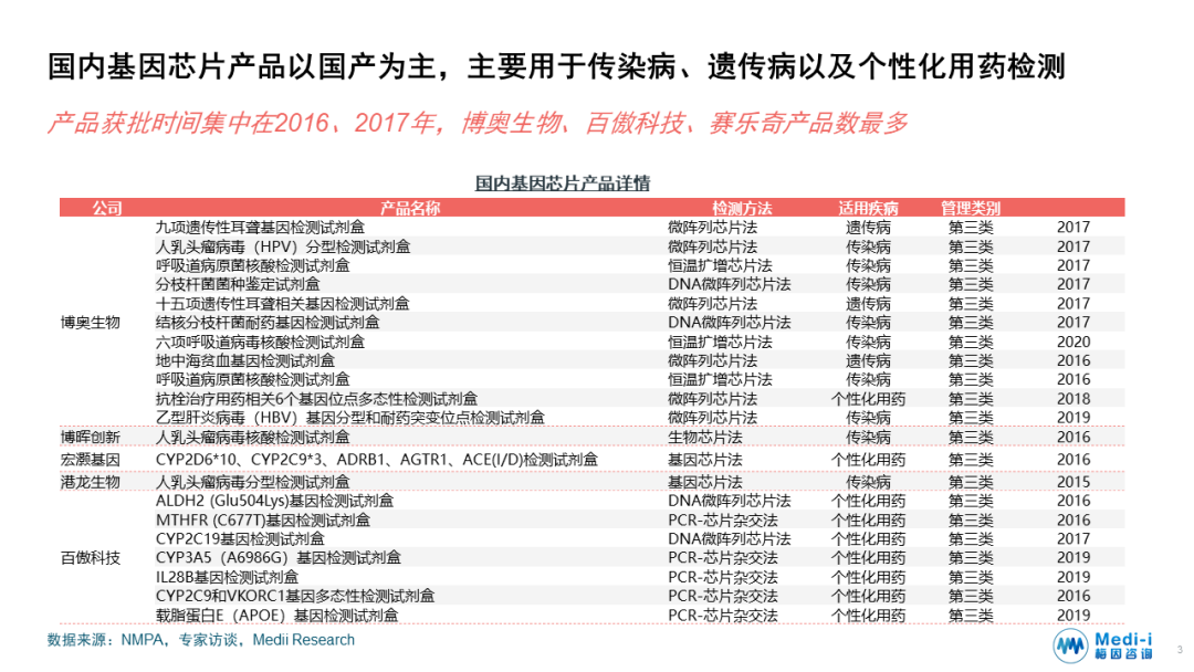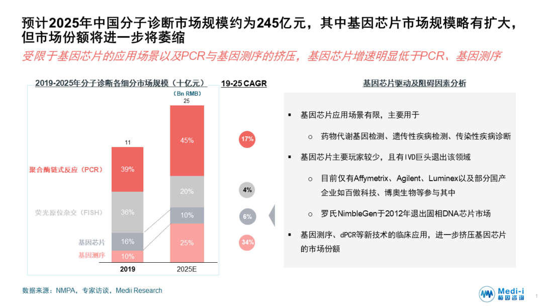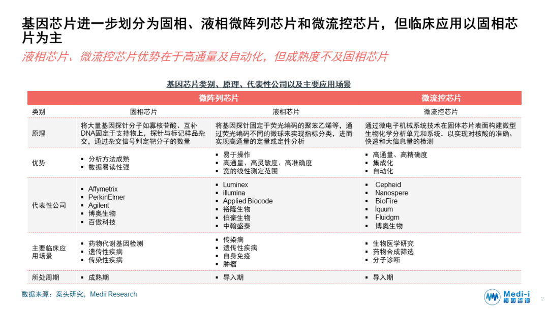 基因芯片作为分子诊断的技术之一,已广泛用于个性化用药(如B-raf基因、K-ras基因等检测)、遗传病检测(如耳聋基因检测)、传染性疾病(人乳头瘤病毒分型、乙型肝炎病毒基因分型等)等领域。 受限于基因芯片的应用场景、为数不多的参与者以及PCR与基因测序的挤压,Medii Research预测2025年中国基因芯片市场规模达25亿元,但市场份额则进一步萎缩。 基因芯片进一步划分为固相、液相微阵列芯片和微流控芯片,但目前临床应用以固相芯片为主。液相芯片和微流控芯片处于导入期,Medii Research预计二者的持续发展将成为基因芯片市场规模扩大的主要动力。 国内基因芯片产品以国产为主,博奥生物、百傲科技、赛乐奇产品数多于其他公司;产品获批时间集中在2016、2017年,近两年鲜有新产品上市;现有基因芯片产品以指导个性化用药为主,检测基因位点较少。基于此,MediiResearch认为基因芯片新产品过慢的获批上市是基因芯片市场份额萎缩的原因之一。 |