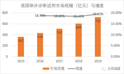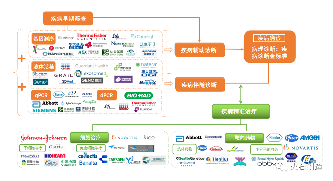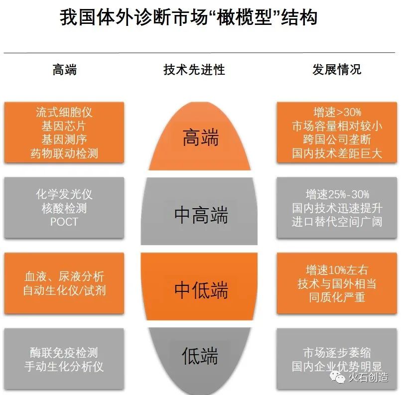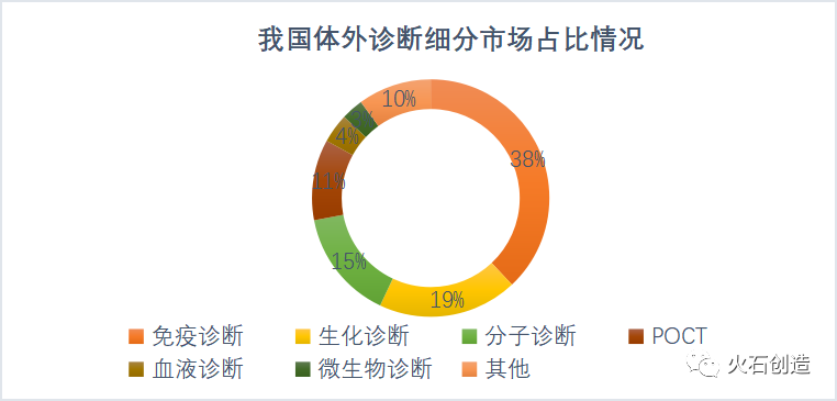 2019年我国体外诊断市场规模约为722亿元,同比增长19.53%,2015-2019年复合增长率为18.84%。 图1:我国体外诊断试剂市场规模(亿元)与增速 数据来源:火石创造数据库 我国体外诊断细分领域市场占比 图2:我国体外诊断细分市场占比 数据来源:公开资料整理 从体外诊断细分领域市场占比来看,免疫诊断、生化诊断、分子诊断是目前体外诊断主要的三大领域,占据70%以上的市场份额。 其中,免疫诊断为我国体外诊断市场规模最大的细分领域,占据38%的市场份额。随着技术的不断迭代,分子诊断和POCT迎来快速发展,市场份额不断上升。 图3:我国体外诊断市场“橄榄型”结构 资料来源:根据公开资料整理 化学发光 我国主流的免疫诊断方法,市场规模已达免疫诊断总市场的70%以上,且基本被罗氏、雅培、丹纳赫等国外巨头垄断,进口替代领域必将取得不错的突破,有望逐步实现高端免疫诊断领域的进口替代。 2 基因测序 属于分子诊断的范畴,被称为决定未来经济的12 大颠覆技术之一。分子诊断技术发展时间较短,国内企业与海外同行技术水平差距相对较小,尤其是基因测序领域,涌现多家优秀企业,如华大基因、达安基因等。 3 POCT 具有空间小、使用方便、高效以及准确度高等多项优势,并且价格普遍偏低。目前POCT整体市场规模不大,但发展很快,未来随着分级诊疗政策的不断落实,POCT 市场将得到飞速发展。 体外诊断产业广受青睐, 背后的原因到底是什么? 1. 以分子诊断为主的体外诊断技术是精准医疗的重要组成部分 图4:精准医疗图谱 资料来源:公开资料整理