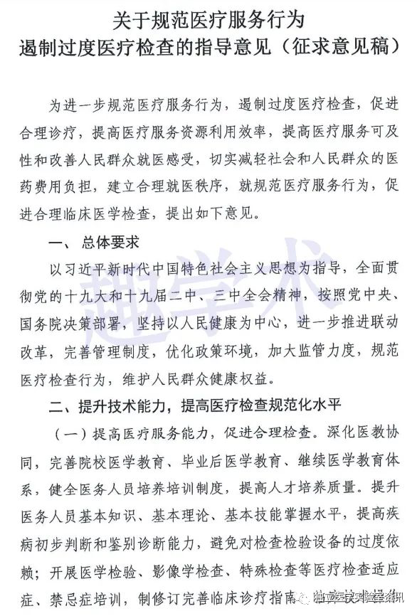 趣学术搜索进一步发现,在去年9月份,有一份名为《关于规范医疗服务行为遏制过度医疗检查的指导意见(征求意见稿)》网络上流传,其内容和上述省市透露出的规范医疗服务、遏制过度诊疗的内容十分吻合,趣学术将内容分享如下,供行业参考,当然,我们也期待深改组批准通过的文件的正式发布,一切均以正式文件为准。