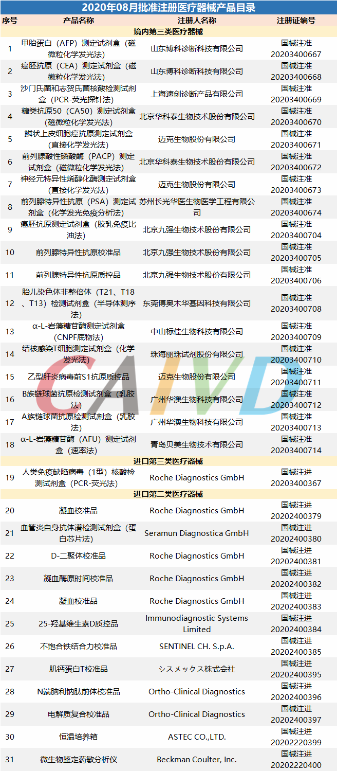 2020年8月,国家药品监督管理局共批准注册医疗器械产品96个。其中,体外诊断产品31个,境内第三类体外诊断产品18个,进口第三类医疗器械产品1个,进口第二类医疗器械产品12个,详细如下: