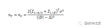 PT、PC分别为试验组和对照组预期事件发生率;为两组预期率差的绝对值, = ,∆为非劣效界值,取负值。 当试验组和对照组按照1:1随机化分组,主要评价指标为定量指标且方差齐时,其样本量估算公式为: