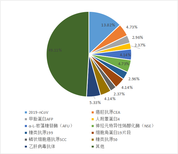 2020年1-9月国家药监局共批准国内IVD产品238款,进口IVD产品45款,其中国内注册IVD产品中分子诊断试剂产品61个,分子诊断设备7个,分析软件1个,生化免疫试剂产品169个。 国产分子诊断产品 分子诊断试剂产品检测靶标分布 从已注册的分子诊断产品检测靶标的分布来看,2020年1-9月份市场注册热点为2019-nCoV核酸检测产品,然后是HBV和CYP2C19基因检测产品。 分子诊断注册产品技术分布 荧光定量PCR技术依旧是分子诊断产品主流技术选择,1-9月NGS技术获批的产品达到了7款,成为分子诊断领域第二大主流技术,这7款试剂如下图: 除上述61款分子诊断产品之外,分子诊断设备也有7款获批,分别是泛生子、金圻睿、华大基因和博奥晶芯的4款基因测序仪,奥然、之江、卡尤迪的3款荧光PCR仪。 国产生化免疫产品 生化免疫产品检测靶标分布 生化免疫产品共有169个取得临床注册证,从上图可知,2019-nCoV检测产品占比达到13.02%,依旧为市场重点关注产品,当然新冠相关产品今年临床注册多采用绿色通道,因此获证时间要远远小于其他产品;癌胚抗原CEA、糖类抗原50和细胞角蛋白19片段检测产品依旧是当前拿证主流产品。 生化免疫试剂的检测技术分布 从图中可知,磁微粒化学发光技术、直接化学发光、化学发光免疫为当前三大主流技术,其占比分别达到了18.93%、18.93%和23.67%。 IVD进口产品 进口的45款IVD产品当中,分子诊断试剂产品为6款,生化免疫试剂产品31款,IVD设备8款。其中IVD设备的清单如下: 进口注册产品的靶标选择上也与国产产品存在较大的差异,具体如下图: 申明:以上为IVD从业者平台人工整理,难免存在纰漏,精确数据请以药监局官方数据为准。 |