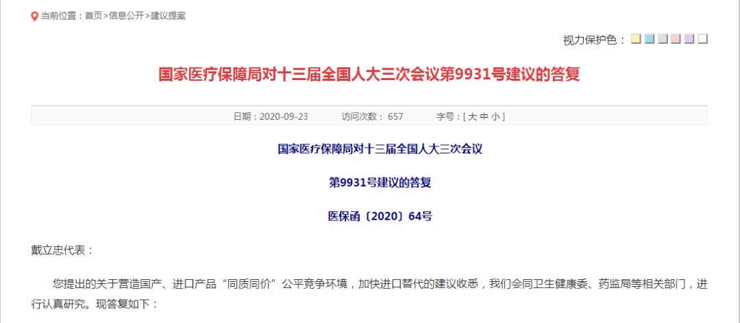 近日,国家医疗保障局对戴立忠代表提出的“营造国产、进口产品“同质同价”公平竞争环境,加快进口替代的建议”给出答复。