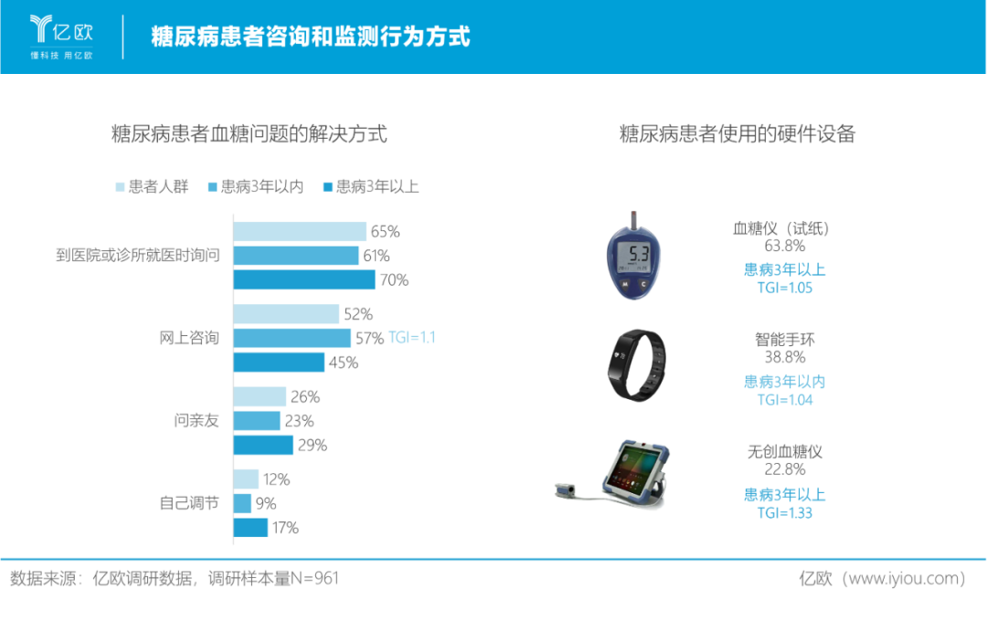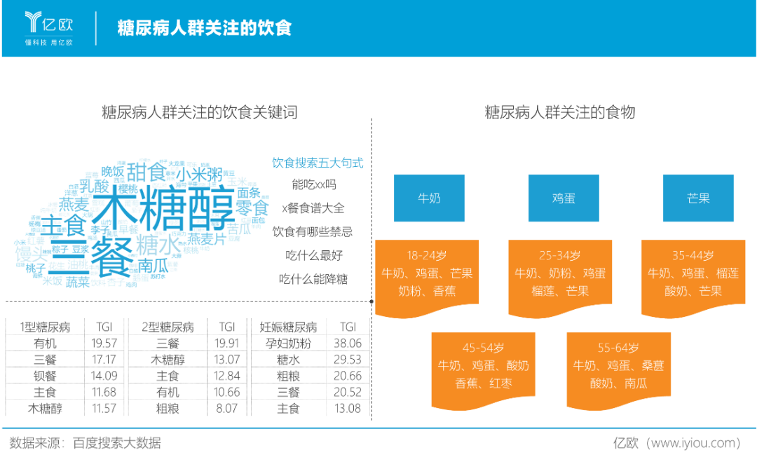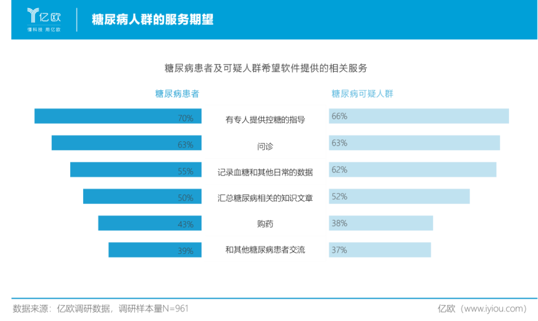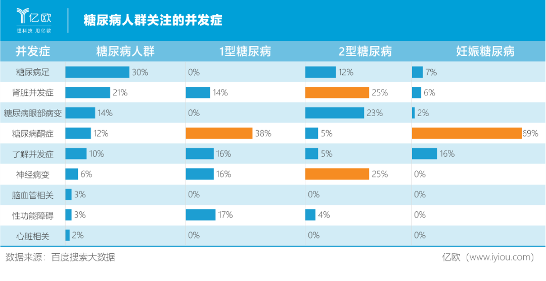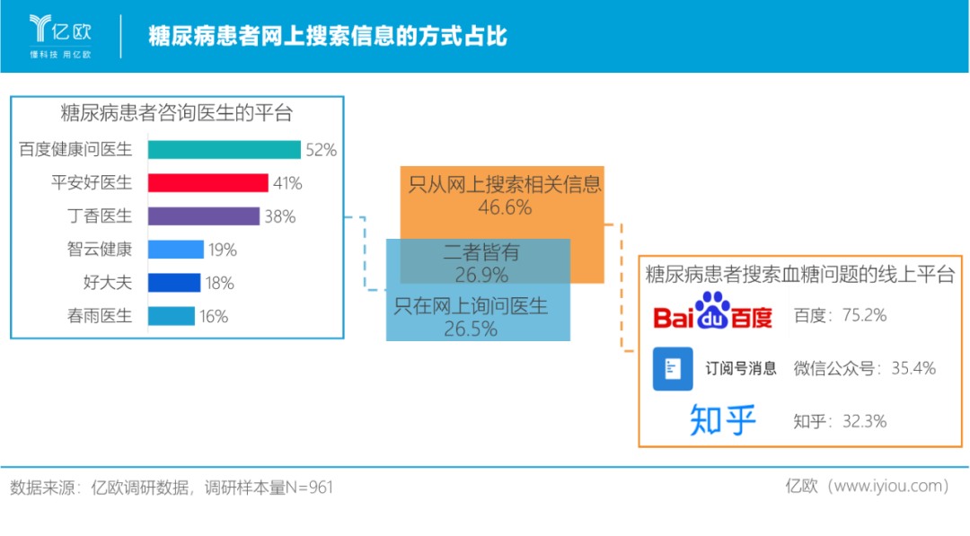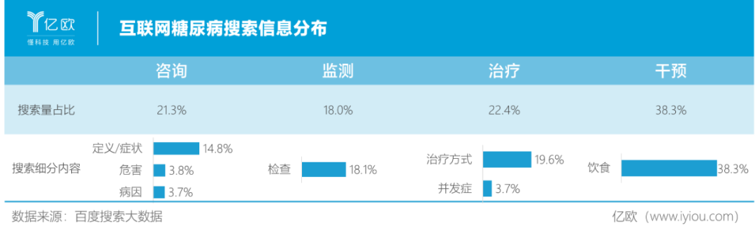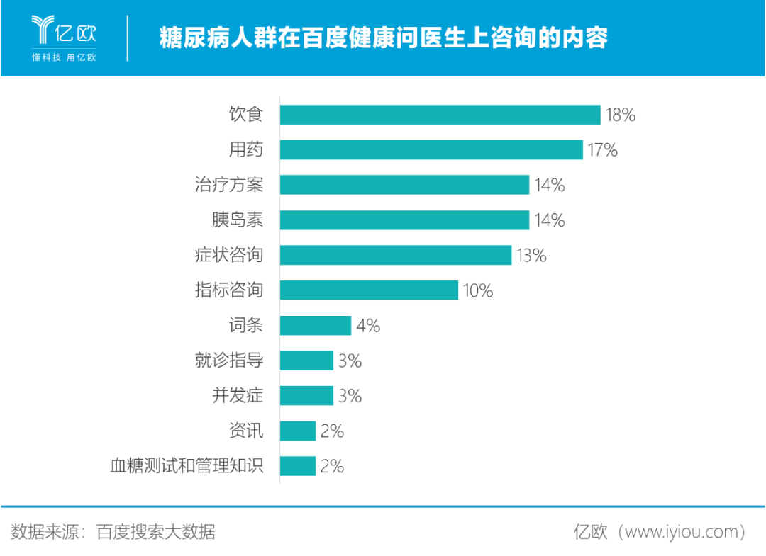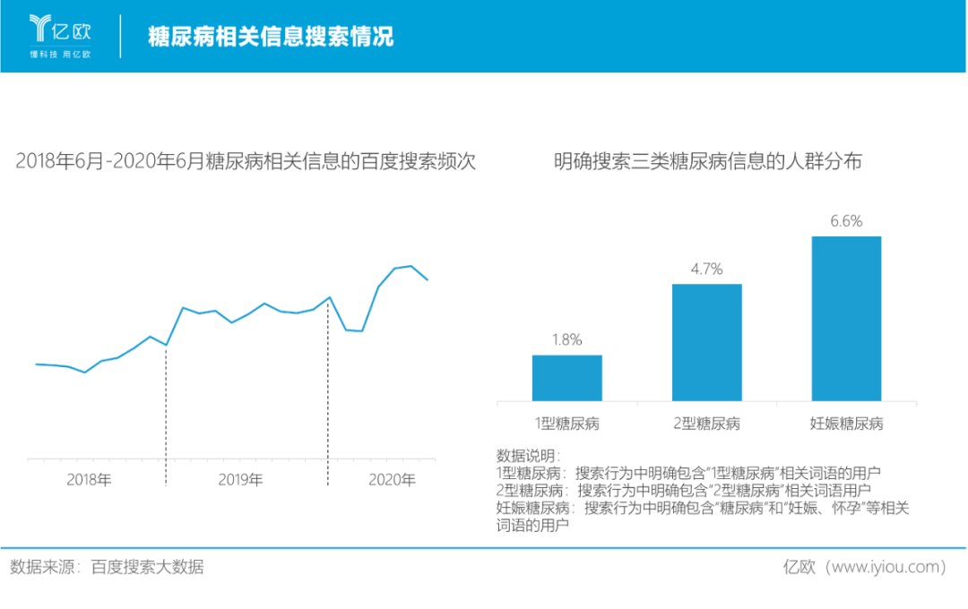 糖尿病是一组因胰岛素绝对或相对分泌不足和(或)胰岛素利用障碍引起的碳水化合物、蛋白质、脂肪代谢紊乱性疾病,以高血糖为主要标志。[1]根据国际糖尿病联盟(IDF)公布的数据显示,截至2018年,已有1.1亿人确诊患有糖尿病。从2011年至2018年确诊患者数量以年复合增长率3.5%的比例在增长。 据世界卫生组织统计,糖尿病并发症高达100多种,是目前已知并发症最多的一种疾病。通过长期的监测血糖,改善饮食、运动等生活习惯,可以有效地帮助糖尿病患者控制血糖。但长久以来,很多人的观念依然停留在“重治疗、轻预防”上。为了改变这一现状,国务院办公厅于2017年印发了《中国防治慢性病中长期规划(2017-2025年)》,其中提到2020年高血压、糖尿病患者规范管理率需要达到60%,2025年需要达到70%。无论从国家政策角度还是患者的角度看,糖尿病管理都是患者需要重视的一环。 随着移动互联网的发展,在“万物皆可互联网”的时代,各大互联网公司正在逐步探索着如何将糖尿病管理线上化。糖尿病互联网管理在经历了2014“百糖大战”的膨胀期, 2015-2018年的破灭期,2020年逐渐迎来了复苏期,糖尿病互联网管理来到了3.0时代。 糖尿病管理始终是糖尿病患者的刚需。但如何深入的理解患者,提供真正匹配糖尿病患者的管理服务是目前亟需讨论的问题。 糖尿病人群特征洞察 越来越多的人通过互联网搜索糖尿病相关信息。根据百度搜索大数据显示,2018年6月至2020年6月,糖尿病相关信息搜索频次的年复合增长率高达38%,相比于糖尿病患者的3.5%的增幅,其增长速度可见一斑。 1型糖尿病、2型糖尿病和妊娠糖尿病人群都倾向于通过互联网了解相关疾病信息,其中妊娠糖尿病人群对互联网搜索获取疾病知识的倾向性更高。根据百度搜索大数据显示,在所有搜索糖尿病相关的人群中,共13.2%的人搜索时明确带有糖尿病类型,其中有1.8%的人在搜索中明确包含“1型糖尿病”相关词语,有4.7%的人在搜索中明确包含“2型糖尿病”相关词语, 6.6%的人搜索中明确包含“糖尿病”和“妊娠、怀孕”等相关词语。 通过饮食干预血糖,是糖尿病人群最关注的信息。根据糖尿病人群搜索的主要信息可将其分为糖尿病互联网管理的四大类,分别为咨询、监测、治疗以及干预。根据百度搜索大数据显示在糖尿病互联网管理的环节中,搜索频次最高的就是饮食干预环节,可见糖尿病人群最关注的信息是通过饮食方式调节血糖。 糖尿病人群行为偏好 大部分患者选择先利用互联网平台搜集糖尿病相关知识。根据数据显示,在通过互联网咨询血糖相关问题时,有46.6%的患者选择只从网上搜索相关信息,26.9%的患者选择搜索信息与询问医生相结合的方式,26.5%的患者选择只在网上询问医生。 在从网上搜索糖尿病相关信息的患者中,超过七成的患者选择从百度平台搜索问题对应的相关信息,其次两个平台分别为微信公众号和知乎。而患者在网上询问医生时,选择最多的平台是百度健康问医生,其次为平安好医生和丁香医生。百度作为强大的搜索入口,是患者在进行信息搜索时的首选平台。 根据百度搜索大数据显示,糖尿病人群通过百度健康问医生平台咨询时关注的五大重点问题依次为饮食、用药、治疗方案、胰岛素以及症状咨询。亿欧认为,饮食之所以为首要关注点是由于血糖管理是一个持续且漫长的过程,饮食控制是保证血糖稳定的首要因素。 使用饮食干预方式进行糖尿病管理是糖尿病人群关注的重点。糖尿病患者对饮食的控制是控糖过程中最重要的一环。根据百度搜索大数据显示,糖尿病人群最关注的饮食关键词包含了“木糖醇”、“三餐”、“主食”等;“能吃××吗?”是糖尿病人群在进行饮食搜索时的最常用句式。糖尿病患者关注的主要食品前三名分别是牛奶、鸡蛋和芒果,可见糖尿病人群对于摄取蛋白质较为关注,对于芒果中糖分的摄取也较为关注。 患病时长3年是糖尿病患者行为的分水岭。在糖尿病前期咨询阶段,虽然大多数患者选择了到医院咨询的方式,但患病时长3年以内的患者更偏好通过网上咨询的方式解决血糖问题。主要由于在患病初期,患者尚处在糖尿病知识“空白”阶段,对于各类知识不是完全掌握,所以选择通过网上咨询作为获取知识的补充方式。 在糖尿病监测阶段,相比于患病时长超过3年的患者,3年以内的患者认为自身血糖的稳定程度一般,所以在进行血糖监测的时候,除了使用常规的血糖仪监测,还会使用智能手环监测体征数据。主要由于3年内患者对各类饮食的升糖情况不是很了解,所以更倾向于携带智能手环,实时监测自身的体征数据,作为补充了解自身的变化依据。 糖尿病导至的长期血糖增高,将引起大血管、微血管受损并危及心、脑、肾、周围神经、眼睛、足等。百度搜索大数据显示,糖尿病人群最关注的并发症是糖尿病足,其次是肾脏并发症以及糖尿病眼部病变。具体到各类型糖尿病相关并发症搜索上,1型糖尿病关注最多的并发症是糖尿病酮症,2型糖尿病关注最多的并发症为肾脏并发症以及神经病变,而妊娠糖尿病关注最多的并发症为糖尿病酮症。 糖尿病人群最看重的是线上服务定制化。根据调研数据显示,糖尿病患者以及可疑人群最希望软件提供的相关服务为“有专人提供控糖的指导”,其次为问诊以及记录血糖和其他日常数据。关注血糖人群认为“模板式”