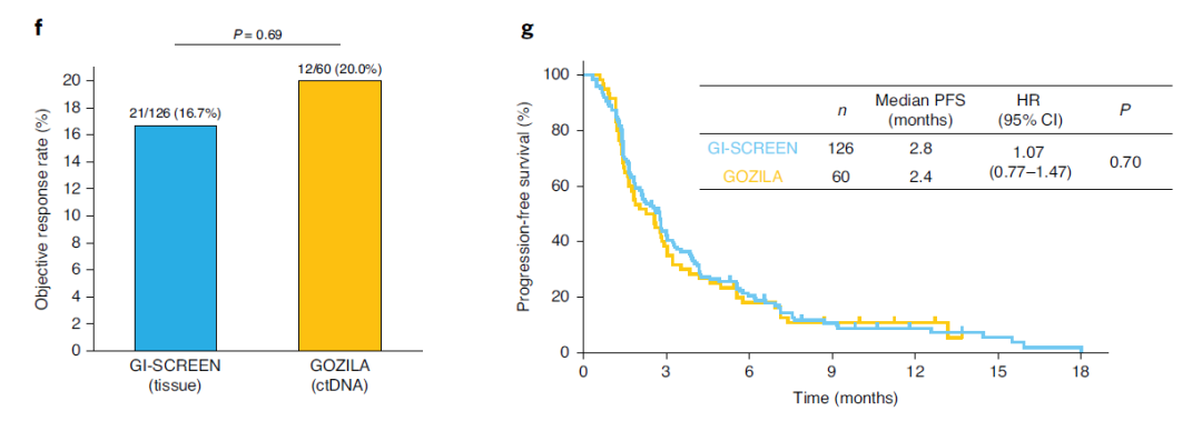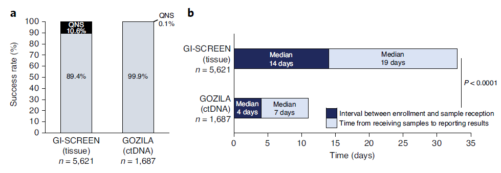 随着精准肿瘤学的进步,对新型靶向药物、药物使用以及临床试验等研究的加速,使得我们对癌症及其治疗的了解越来越深入,这有助于提高诊治效益,改善预后。但目前只有少数癌症患者能够从基因组匹配的靶向治疗中受益,许多靶基因仅存在于一小部分患者中,这意味着每项临床研究必须筛选成百上千的患者。传统的患者入组方式存在筛选期长、入组人群、组织活检等限制,导至患者的入组率较低。 近日,发表在Nature Medicine上的一项针对多种胃肠道癌症的最新研究结果显示,基于ctDNA基因分型可显著缩短筛选患者入组临床试验的时间(11天 vs 33天),提高了试验入组率(9.5% vs 4.1%)。除加速癌症患者入组临床试验外,ctDNA基因分型还可发现大量临床相关基因突变。该研究揭示了ctDNA基因分型可作为加速精准医学创新的重要工具及提高个别患者的治疗效益。 为了评估ctDNA基因分型的效用,在这项新研究中,日本国立癌症研究中心东病院的研究团队比较了ctDNA基因分型与组织活检对中晚期胃肠道癌症患者的临床试验入组情况。该研究团队分为两项大型试验,一项名为SCRUM-Japan GOZILA的试验使用Guardant360液体活检来识别患者,另一项GI-SCREEN试验则使用组织基因分型。 研究发现,与组织基因分型相比,ctDNA基因分型显著缩短了患者筛选时间(11天 vs 33天),提高了试验入组率(9.5% vs 4.1%),且没有损害治疗功效。该研究还描述了约2,000名晚期胃肠道癌症患者的ctDNA图谱的克隆结构,加强了许多可靶向致癌驱动因素的相关性,并强调了多种新的驱动因素可作为临床开发的候选药物。 文章共同第一作者、日本国立癌症研究中心东病院Yoshiaki Nakamura表示:“研究数据表明,与使用组织活检的临床试验相比,基于Guardant360的ctDNA检测进行基因组谱分析具有缩短周转时间和改善患者入组率的优势,且不影响试验效果。” 该研究以GI-SCREEN为基础,GI-SCREEN是日本国家胃肠道癌症生物标志物筛选项目。GI-SCREEN试验入组患者在全身治疗之前或治疗期间接受组织DNA测序,以参加匹配的治疗试验,但对组织样本的需求会减慢筛选时间。基于这一研究方法,研究团队在GOZILA试验中改用Guardant360检测ctDNA来筛选符合该试验条件的患者。 2015年2月~2019年4月,GI-SCREEN招募了5743例晚期胃肠道癌症患者。2018年1月~2019年8月,GOZILA招募了1787例患者。数据显示,ctDNA基因分型使得招募患者的相对比例增加了132%,入组率提高了98%。其中,GI- SCREEN每月平均招募4.1名患者,液体活检试验组招募8.1名患者。此外,ctDNA基因分型还可将患者从接受研究入选筛查到参加临床试验的时间从中位数5.9个月减少到中位数1个月,缩短了83%。同时,从样本收集到试验入组的中位时间从20.2个月降至1.1个月。(图1) 为了评估ctDNA基因分型是否能准确识别出合格患者,研究人员比较了两种检测方法筛选出患者的客观缓解率(ORR)和无进展生存期(PFS)。组织筛选患者与ctDNA筛选患者表现出相似的ORR(20.0 vs 16.7%;图2)和PFS(中位,2.4 vs 2.8个月;图2)。综上所述,ctDNA基因分型可缩短患者筛选时间并增加试验入组人数,且不会影响试验结果。 随后,研究人员评估了ctDNA基因分型筛选患者的基因组概况,包括结直肠癌(CRC)、胃食管腺癌(GEA)、食道鳞状细胞癌(ESCC)、胰腺导管腺癌(PDAC)和胆管癌(CCA)患者。总体而言,研究团队在91.4%(1438 / 1573)的患者中检出了ctDNA,ESCC和CRC显示出最高的ctDNA检测率,分别为99.1%(107/108)和96.0%(628/654),而PDAC和GEA最低,分别为83.4%(304/363)和85.8%(223/260)(图3)。 Guardant360检测可分析74个基因,基于此,研究团队分析了该研究发现的遗传改变。结果显示,在入组患者中能够识别出多种基因突变,尤其是KRAS、NRAS、BRAF和PIK3CA中的突变。此外,研究还确定了ERBB2、FGFR1-2和MET扩增、FGFR2-3、ALK、NTRK1和RET融合以及微卫星不稳定性。 对于ctDNA基因分型试验组中232位同时具有ctDNA和组织基因分型数据的CRC患者,两种检测方法结果在总体上高度一致。ctDNA基因分型可揭示临床相关的较高频率的基因突变。 该研究数据表明液体活检可作为临床研究中的重要工具,通过缩短筛选时间加快试验入组,且不会牺牲患者识别质量或以生物标志物为靶标的药物的疗效。此外,该研究补充了在晚期癌症患者个性化治疗护理中常规使用ctDNA检测的其他研究,并且有可能极大地促进精准医学创新的发展。 参考资料: 1.Clinical utility of circulating tumor DNA sequencing in advanced gastrointestinal cancer: SCRUM-Japan GI-SCREEN and GOZILA studies. Nat Med (2020). https://doi.org/10.1038/s41591-020-1063-5 2.Guardant Health Liquid Biopsy Test Improves Gastrointestinal Cancer Clinical Trial Enrollment https://www.genomeweb.com/cancer/guardant-health-liquid-biopsy-test-improves-gastrointestinal-cancer-clinical-trial-enrollment#.X3_BWp2wOM8 |
