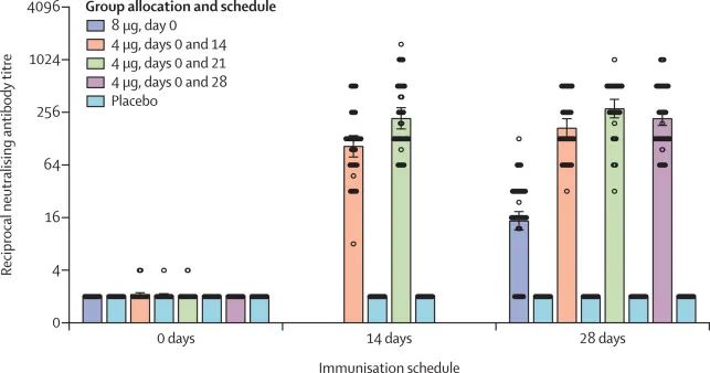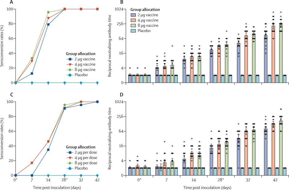 ▎药明康德内容团队编辑 日前,《柳叶刀-传染病》(The Lancet Infectious Diseases)最新发表了中国又一款新冠灭活疫苗BBIBP-CorV的临床研发进展。1/2期试验中,这款候选疫苗在所有18-80岁的健康受试者中都表现出了良好的安全性,并都成功诱导了免疫反应。其中,两种加强接种方案诱导的抗体滴度更为理想。 这项研究由北京生物制品研究所有限责任公司、中国疾病预防控制中心、清华大学等多家机构共同合作完成。这是继武汉生物制品研究所及合作团队在《美国医学会杂志》(JAMA)发表新冠灭活疫苗临床试验数据后,中国生物发布的又一新冠灭活疫苗临床试验数据。相比之下,此次BBIBP-CorV还额外在60岁及以上人群中获得了数据。 截图来源:The Lancet Infectious Diseases从疫苗设计上看,这款在研灭活疫苗使用了一名中国患者体内分离出的病毒样本,在实验室培养后进行灭活,同时还加入了佐剂成分氢氧化铝,用来增强免疫反应。2020年4月29日-7月30日,研究团队在中国600多名健康志愿者开展了这款候选疫苗的1/2期随机对照试验。1期试验的主要目的是探索BBIBP-CorV的安全剂量。共纳入192例健康受试者,分为18-59岁和60-80岁组,每个年龄组人群都再1:1:1:1随机分组,以评估低、中、高剂量疫苗的安全性,分别在试验第0和28天各接种一次不同剂量(2 μg、4 μg、8 μg)的疫苗,或安慰剂。2期试验则主要为了确定最佳的疫苗接种间隔。共448例18-59岁受试者1:1:1:1随机分组,接受不同时间间隔的接种方案,每组中疫苗和安慰剂人数为3:1。四组的接种方案分别是:第0天接种一剂8μg的疫苗/安慰剂,或第0天和14天、或第0天和21天、或第0天和28天分别接种两剂4μg疫苗/安慰剂。 结果显示,这款疫苗在所有测试剂量下均安全且耐受性良好。1期试验中,在接种后7天内,有29%的受试者报告了至少一种不良反应。最常见的副作用是注射部位疼痛,分别有24%疫苗组受试者和6%安慰剂受试者出现。其次是发热(18-59岁,2μg组4%,4μg组4%,8μg组8%;≥60岁,8μg组中4%),但均为轻微和自限式的,不需任何治疗。所有不良反应均为轻度或中度。最后一剂疫苗接种后的28天内,都未报告严重不良事件。2期试验的结果相似。23%疫苗接种者在接种后7天内报告了至少一种不良反应,所有其他不良反应也均为轻度或中度。1期试验中,在接种后第28天时,18-59岁组所有接种疫苗的受试者体内都出现了抗体反应。60岁及以上年龄组疫苗接种者的免疫反应则稍慢一些,整体抗体水平也略低,但在第42天时他们体内也都出现了抗体反应。安慰剂组均未出现相应抗体反应。 ▲18-59岁和60岁及以上受试者的抗体阳性率(A/C,定义为接种后抗体滴度比基线至少增加四倍)和中和抗体滴度(B/D)(图片来源:参考资料[1])整体来看,高剂量组疫苗引起的中和抗体效价明显高于低剂量组,但与中剂量组无明显差异。此外,疫苗引起的中和抗体可以中和多种病毒株,包括当前带有突变体的大流行自然变异株(D614G)。“BBIBP-CorV在60岁及以上老年人中诱导了抗体反应的表现令人鼓舞。” 研究通讯作者之一,北京生物制品有限公司杨晓明教授解释:“保护老年人是新冠疫苗的关键目标,因为老年人一旦感染新冠,面临的重症风险更大。由于老年人免疫系统功能衰退,疫苗的效果通常会受到影响。”2期试验结果显示,在接种第28天时,两次接种4μg的三组疫苗受试者体内,疫苗引起的中和抗体滴度都显著高于8μg接种一次(14.7),其中0/21天4μg(282.7)和0/28天4μg(218.0)方案的抗体滴度比0/14天(169.5)更高。 ▲不同接种方案的中和抗体滴度(图片来源:参考资料[1])据研究团队介绍,该候选疫苗诱导的中和抗体水平也与其他疫苗研究报道的水平相当。杨晓明教授还指出,“研究结果表明,加强接种对于实现针对新冠病毒的最大抗体反应是有必要的,并且可能对保护效力至关重要。这为3期试验提供了有用的信息。”研究团队也表示,目前研究还存在一定的局限,比如随访时间只有42天,未纳入18岁以下人群。不过,在对成人组数据完整分析后,将计划在儿童和青少年中进行试验。在《柳叶刀-传染病》同期发表的评论文章,俄罗斯圣彼得堡实验医学研究所的Larisa Rudenko教授称赞这是一款充满前景的疫苗,也指出了还需要未来研究补充的信息,比如这款灭活疫苗能否诱导和维持病毒特异性T细胞应答?“因为CD4+T细胞对于最佳抗体应答以及细胞毒性CD8+T细胞活化都很重要,而在中和抗体保护作用不完全的情况下,这对于病毒清除至关重要。”目前,BBIBP-CorV疫苗的3期试验正在阿拉伯联合酋长国开展。我们期待进一步的数据,能够回答这款候选疫苗对新冠感染的预防作用。