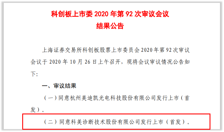 | ▲上交所审议同意科美诊断技术股份有限公司发行上市(首发)(图片来自:上交所)上海证券交易所科创板股票上市委员会2020年第92次审议会议于2020年10月26日上午召开,会议审议同意科美诊断技术股份有限公司(以下简称“科美诊断”)发行上市(首发)。