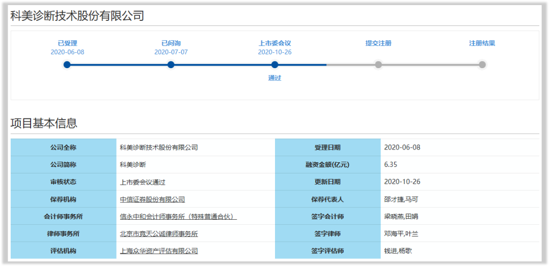 ▲科美诊断科创板申请时间线(图片来自:上交所) 据悉,科美诊断于今年6月8日向上海证券交易所成功递交上市申请。历时近半年,IPO冲刺之路终见曙光。