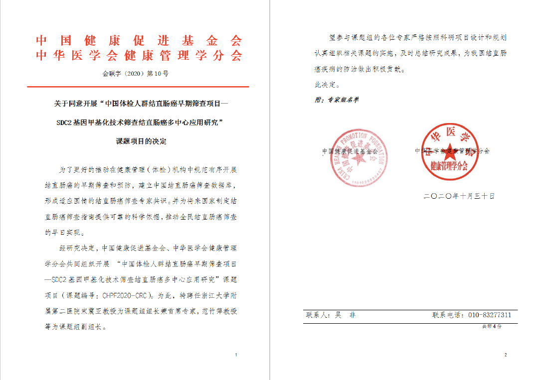 11月1日,癌症早筛领军企业康立明生物宣布启动10万人肠癌早筛多中心研究项目。 据悉,该多中心研究项目“中国体检人群结直肠癌早期筛查项目——SDC2基因甲基化技术筛查结直肠癌应用多中心研究”由中国健康促进基金会、中华医学会健康管理学分会共同组织开展,在2020年10月31日召开的第二届浙江省医师协会全科健康管理专业委员会学术会议暨第六届广济全科大会在2020年第八届西湖论健上正式启动,并成立了课题专家组。特聘任浙江大学附属第二人民医院宋震亚教授为课题组组长兼首席专家,范竹萍教授等为课题组副组长。 该研究项目旨在更好的推动在健康管理(体检)机构中规范有序开展结直肠癌的早期筛查和预防,建立中国结直肠癌筛查数据库,形成适应国情的结直肠癌筛查专家共识。并为将来国家制定结直肠癌筛查指南提供可靠的科学依据,推动全民结直肠癌筛查的早日实现。 康立明生物的人类肠癌SDC2粪便基因检测试剂盒长安心®于2018年11月20日获中国国家药品监督管理局(NMPA)注册审批的三类体外诊断试剂注册证,成为我国首个、也是迄今为止唯一一个获批上市的肠癌粪便DNA检测产品。 日前,长安心®另一项多中心临床试验数据“Robust performance of a novel stool DNA test of methylated SDC2 for colorectal cancer detection: a multicenter clinical study”已经发表在国际领先学术期刊Clinical Epigenetics上。 该研究报道的是长安心®来自中山大学附属第六医院(PI:汪建平教授)、南方医科大学南方医院(PI:刘思德教授)和山东省肿瘤医院(PI:宋现让教授)三个临床试验中心的数据,文章中描述了长安心®在临床场景中对早期肠癌和进展期腺瘤的检测具有优异的灵敏度和特异性。 数据显示,在来自三个临床中心的1110例有效样本(包含359例肠癌和38例进展期腺瘤)中,长安心®在特异性为699/713(98.0%)时,对I-Ⅳ期结直肠癌的敏感性为301/359(83.8%),对进展期腺瘤的敏感性为16/38(42.1%),尤其对可以根治的早期(I-II期)结直肠癌的敏感性高达134/154(87.0%)。长安心®对结直肠肿瘤的检出率不因年龄、肿瘤位置、分化程度和TNM分期的不同而有显著差异,可以实现全肠道检测、无检测盲区,且适用于任何人群。 探究其他癌种和疾病的干扰试验显示,与肠道肿瘤无关的其他癌症和疾病对检测基本上不会产生干扰,再次证明长安心®特异性好,假阳性低,避免了过度诊疗和受检者的过分担忧。长安心® kappa值为0.84,表明与结肠镜和(或)病理具有良好的诊断一致性。 此外,在临床试验中还对40例结直肠癌切除根治术前、后的受试者进行了短期随访,检测结果显示在结肠切除术前有38例检测为阳性,肿瘤切除后,除1例患者因ACTB内控测定值无效外,其余均为阴性,显示了长安心®在结直肠癌术后随访中潜在的应用价值。 广州市康立明生物科技有限责任公司是由优秀科学家团队创办的一家高科技生物公司。公司于2015年1月登记注册,专注于长安心®粪便DNA肠癌检测试剂盒等肿瘤早期诊断产品以及相关自动化检测设备的研发、生产和销售,并可提供相应的检测服务。 康立明生物公司总部落户于广州高新技术产业开发区,包括研发实验室、GMP生产车间、综合办公区、第三方医学检验实验室等;在天津、武汉、济南等地搭建了第三方医学检测实验室,超16000平方米,此外,于2020年3月份收购好芝生物公司,基础研发和团队力量进一步加强。 公司拥有国际前沿的科研能力和众多独立的知识产权,未来还将继续加强,并将成果转化为成生产力。除了长安心®肠癌检测产品之外,公司还在开发肺癌和膀胱癌等肿瘤的早期诊断产品和即时检测设备系统,并已取得令人惊喜的阶段性成果。 目前,康立明生物已完成多轮优质风险投资,并获得了国家、省、市、区各级政府的大力支持,成为行业内备受关注的明星企业。公司本着“人类健康,我之使命”的崇高理想,力争在慢性病尤其肿瘤的早诊早治、预后监测等领域取得突破和发展,最终造福人民。 |