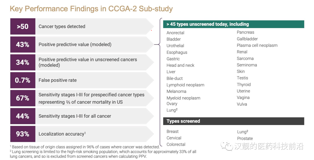CCGA-2研究共包含了6700名受试者(4487名来自CCGA以及2,202来自STRIVE),其中2,482名是癌症患者,另外4,207名是非癌症患者,基于CCGA-2研究推出的泛癌种肿瘤早筛产品Galleri的关键表现如图3所示。