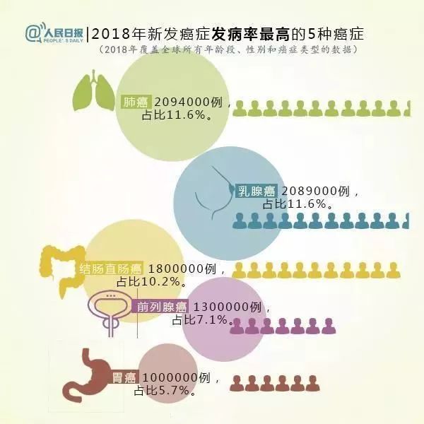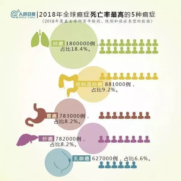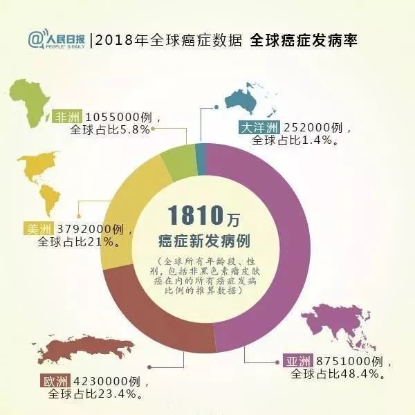 2018年全球预计有1810万癌症新发病例和960万癌症死亡病例(全球所有年龄段、性别,包括非黑色素瘤皮肤癌在内的所有癌症发病比例的推算数据)。