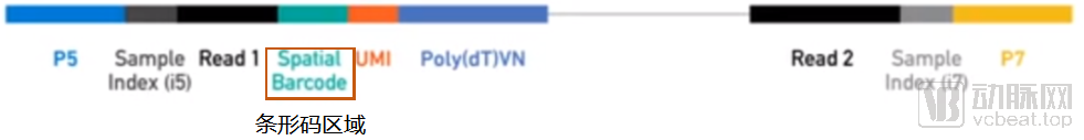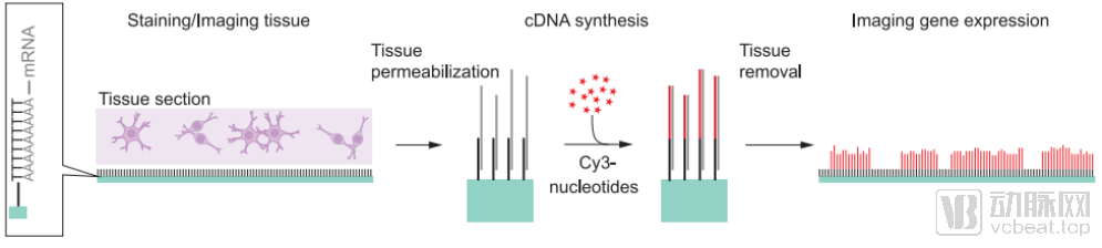 被放置在芯片区域内的冰冻组织切片在经过H&E染色和成像记录后,会被进行透化处理,释放细胞中的RNA。芯片上的捕获引物的中段设置了带有独特标识的条形码区域。芯片被划分为了数个不同的捕获区域,每个捕获区域中锚定的引物都带有不同的条形码序列。每个区域对应的组织位置会被记录下来,然后再进行测序后,通过条形码将不同区域的测序结果,映射到对应的组织位置上,最终拼贴形成组织样品的空间转录组图像。