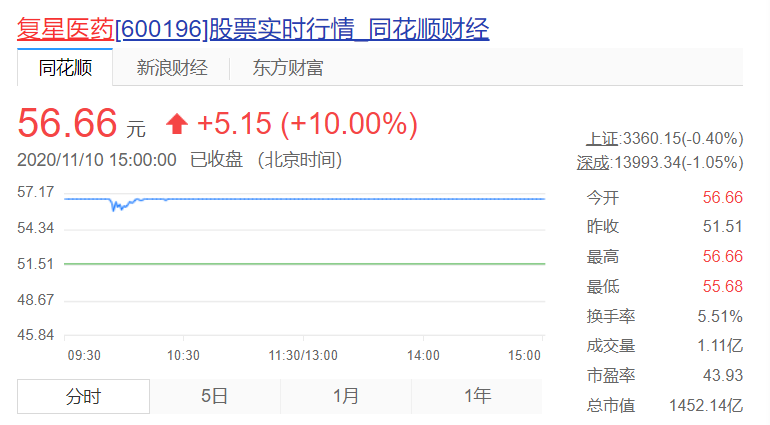 就在11月9日晚间,美国辉瑞公司(NYSE: PFE)和德国拜恩泰科(BioNTech)宣布,根据三期临床试验的初步分析数据,联合研发的mRNA疫苗有效率高达90%,而普通流感疫苗也只有70%左右的保护率,远超此前的预期,更远远高于FDA要求的50%以上即可获批上市。 这则关于新冠疫苗的重大突破消息引发市场关注。 值得一提的是,复星医药是BioNTech mRNA新冠疫苗在大中华区的研发合作伙伴。 受到该消息影响,11月10日,A股复星医药(600196.SH)开盘即涨停,报56.66元。港股复星医药(02196.HK)盘中一度大涨超过20%,收盘涨幅14.22%。 10日,复星医药发布公告,公司控股子公司复星医药产业获BioNTech授权在区域内开展mRNA新型冠状病毒疫苗产品的开发和商业化。复星医药产业与BioNTech就新冠疫苗在区域内的合作在有序推进中。 截至目前,全球范围内尚无基于mRNA技术平台研发的预防性疫苗获得上市批准。在研新冠疫苗在区域内能否获得药品监管机构批准、于区域内的上市时间存在不确定性。 据了解,今年3月,复星医药获得BioNTech授权,在中国大陆及港澳台地区独家开发、注册、商业化基于其专有mRNA技术平台研发的、针对新型冠状病毒的复星新冠疫苗(暂定名“复必泰”),并于7月在国内启动临床试验。 对于mRNA疫苗的进展情况,11月10日中午,复星召开电话会议,复星国际(0656.HK)董事长郭广昌、复星医药董事长吴以芳、复星医药全球研发中心总裁回爱民、复星旅文(1992.HK)董事长钱建农等均参会。