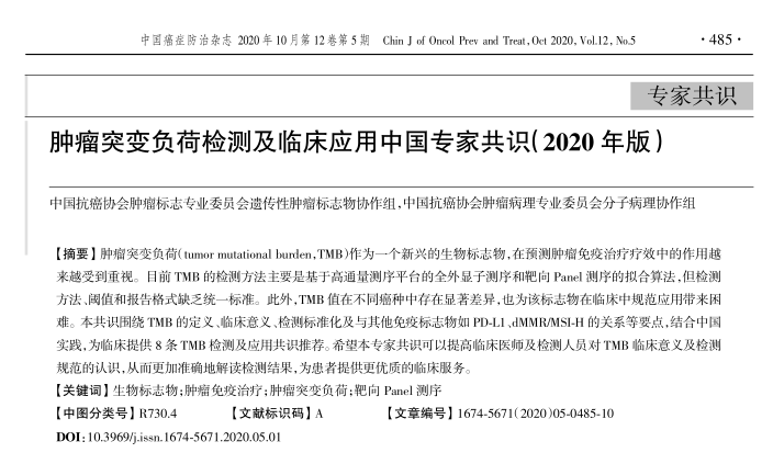 2020年11月11日,由中国抗癌协会肿瘤标志专业委员会遗传性肿瘤标志物协作组和中国抗癌协会肿瘤病理专业委员会分子病理协作组联合编撰的《肿瘤突变负荷检测及临床应用中国专家共识(2020年版)》(以下简称共识)正式在《中国癌症防治杂志》发表。