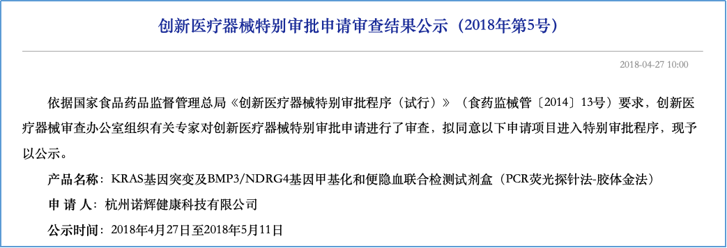 诺辉健康肠癌FIT-DNA联检试剂盒常卫清™ 获NMPA批准上市,成为首个获批 癌症筛查预期用途的IVD产品 2020年11月9日,杭州诺辉健康科技有限公司的“KRAS基因突变及BMP3/NDRG4基因甲基化和便隐血联合检测试剂盒(PCR荧光探针法-胶体金法)”(商品名:常卫清™)获得NMPA批准上市,成为首个也是目前唯一一个获得国家药品监督管理局批准的癌症早筛产品。该产品的注册临床试验“Clear-C”则是中国首个癌症早筛前瞻性大规模多中心注册临床试验。 同泽合信作为本项目的CRO,提供了从创新申报到临床试验在内的全程服务,成功助力诺辉健康取得具有里程碑意义的癌症筛查第一证。 常卫清™预期用途: 本试剂盒用于体外定性检测人粪便样本中的 KRAS 基因突变、 BMP3 和 NDRG4 基因甲基化及血红蛋白,各个指标的检测值通过配套分析软件计算综合评分,用于对肠镜依从性差的结直肠癌高风险人群的筛查。 综合评分大于或等于阳性判断值的样本为阳性,表示受检者体内可能有结直肠癌和/或进展期腺瘤,需要进一步接受肠镜检查;反之,如果综合评分低于阳性判断值,表示受检者体内有结直肠癌和/或进展期腺瘤的可能性低,但并不能完全排除疾病风险。 鉴于受试者为高风险人群,因此在必要时仍应建议进行肠镜检查。 常卫清™申报历程简单回顾: ● 2018年4月,进入国家局创新医疗器械特别审批通道; “Clear-C”(Colorectal Cancer Early Screening in China)注册临床试验,由浙江大学医学院附属第二医院作为牵头研究单位,联合江苏省人民医院、复旦大学附属肿瘤医院、四川大学华西医院、天津医科大学总医院、山西省人民医院、湖北省肿瘤医院、郑州大学第一附属医院共8家具备足够区域代表性的大型三甲医院共同开展,历时16个月,累计入组数据近6000例,实际纳入统计分析数据4758例。 “Clear-C”临床研究的项目负责人、浙江大学医学院附属第二医院丁克峰院长介绍,此次试验有三个特点:一是我国此前从未有过有关肠癌早筛的前瞻性注册临床试验,二是入组样本量大,三是试验结果优异。 临床试验结果显示,常卫清™针对结直肠癌患者筛查的灵敏度为91.94%,对进展期腺瘤患者筛查灵敏度 63.47%,针对结直肠癌和进展期腺瘤筛查特异度为 87.08%;结直肠癌筛查阴性预测值99.6%。 针对结直肠癌患者检测灵敏度 95.54%,检测特异度87.11%。 ● 2020年11月,获得NMPA批准。 |