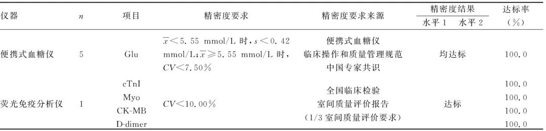 来源:《检验医学与临床》2020年17期、CACLP体外诊断资讯作者:段小勇1,王 晟2△,吴柳春3 三峡大学第三临床医学院/国药葛洲坝中心医院:1.急诊科;2.检验科;3.医疗业务部,湖北宜昌 443002 急诊医学的特点是要以最快的速度、最有效的手段,尽最大可能挽救患者的生命和最大限度地减轻患者的伤残[1],因此需要一种能就地取材、即时报告的检验方法为最终治疗的成功赢取充足时间。而即时检测(POCT)就是一种能够在最接近患者的地点完成标本采集[1]并即刻进行的检测分析,可快速得到检验结果,为患者即时监测或者诊疗提供必要依据[2]的检测模式,能够帮助急诊科医生短时间内得到关于诊断及预后的检测结果[3],有助于疾病的治疗[4]。为确保急诊患者的成功救治同时配合胸痛中心的建设,经本院POCT管理小组的调查研究后决定在急诊科开展包括血糖(Glu)、心肌梗死3项联合检测(以下简称心梗三联)[肌钙蛋白Ⅰ(cTnI)、肌红蛋白(Myo)、肌酸激酶同工酶(CK-MB)]、D-二聚体(D-dimer)的POCT项目检测并进行全面质量管理。现报道如下。 1 资料与方法1.1 一般资料 选取 2018年11月至2019年5月在本院急诊科进行POCT检测的患者1 785例为观察组,其中男916例,女869例;年龄9~95岁,平均(69.2±13.6)岁;Glu检测1 383例,含危急值结果38例;心梗三联检测289例,含危急值结果17例;D-dimer检测113例。选取2018年11月至2019年5月在本院检验科进行上述急诊检验的患者1 821例为对照组,其中男972例,女849例;年龄2~97岁,平均(68.5±14.1)岁;Glu检测1 064例,含危急值结果49例;心梗三联检测536例,含危急值结果34例;D-dimer检测221例。 1.2 仪器与试剂 急诊科在用POCT仪器总计6台,其中美国雅培越佳型便携式血糖仪(以下简称血糖仪)5台,北京乐普乐锐荧光免疫定量分析仪(以下简称荧光免疫分析仪)1台(检测cTnI、Myo、CK-MB、D-dimer)。检验科使用相对应检验仪器为美国贝克曼库尔特AU5800生化分析仪,德国西门子Advia-XP化学发光分析仪和西班牙沃芬ACL TOP700凝血仪,以上仪器均使用原厂试剂及校准品。 1.3 方法 1.3.1 实施准入制和档案化管理 投入急诊科使用的POCT设备及检测项目必须通过精密度、正确度和线性范围的性能验证并由本院检验科出具性能验证合格报告;POCT设备由设备科统一编号并建档管理。使用的血糖仪和荧光免疫分析仪均为全院统一型号,以保证检测结果在院内有良好的可比性。 1.3.2 精密度验证 急诊科开展的POCT项目,每项至少使用2份不同水平的质控品,连续检测20次,计算有效检测结果 以内)的s和变异系数(CV)。1.3.3 线性验证 对精密度验证已通过的各POCT项目进行线性范围评价,包括cTnI、Myo、CK-MB、D-dimer、Glu。选取满足上述项目说明书中线性范围的高值和低值临床血浆标本(Glu标本为同血型全血各1份)。依照卫生行业标准WS/T 408-2012线性评价指南中的方法将该高值和低值标本分别按4∶0、3∶1、2∶2、1∶3、0∶4的比例配制成5个不同水平的标本,每个水平标本重复测试2次,将各水平两个检测结果的平均值作为实测值,同一项目线性验证的所有测试必须30 min内完成。依据各标本不同的稀释比例计算出其理论值和预期值,再将两者进行回归分析与线性检验,若线性回归方程的相关系数r≥0.975或R2≥0.95,则认为该项目在验证中选取的低值至高值范围内线性评价通过验证。 1.3.4 正确度验证 即比对试验,每半年开展1次POCT检测项目与大型检验仪器检测结果的比对。具体方案和判断标准见表1。 表1 比对试验方案和判断标准 注:*本院cTnI危急值范围为>0.5 μg/L。 1.3.5 制订标准操作流程 内容涵盖检测前、中、后的全部过程[5]。(1)检测前包括仪器及加样工具的使用条件和清洁要求、试剂及耗材的储存和使用、标本的正确采集、科内交接的标准流程等。(2)检测中包括室内质控的频率(每24 h必须进行1次室内质控检测并记录在案)和要求[各项的质控靶值均使用累计该项目3~5个月在控数据汇集的所有数据计算的累积平均数;质控规则仅设1~3s(控制限)失控规则,其中Glu的控制限同该项目比对试验合格判断标准;D-dimer的控制限为其质控靶值±25%数值区间;cTnI、Myo和CK-MB的控制限为其质控靶值±30%数值区间]、标准的加样方式(要求加样工具定期校准)、规范的项目检测操作流程、复检规则(与临床表现不相符时必须使用另一检测系统进行复检)和危急值登记等。(3)检测后包括检测报告的内容和形式、保存方式与期限、检测完成标本及其他医疗废弃物的处置等,并指定专人负责仪器与加样工具的维护保养和质控[6]。 1.3.6 定期评价 (1)配合医疗业务部进行每月1次的操作规范与室内质控检查,规范操作各项日常操作;(2)参加每半年1次POCT检测项目的比对试验,如发现不达标仪器立即淘汰更新。 1.4 实际应用效果评估指标 1.4.1 标本周转时间(TAT) 从医生申请检验项目到收到检验报告的时间[7]。 1.4.2 复检准确率 发现检测结果(Glu除外)与病情不符再次复检时,复检结果相同标本数占复检标本数的比例[8]。复检时使用相同标本在另一个检测系统上复测。 1.4.3 危急值抢救成功率[9] 指患者危急值状态解除(判断标准:Glu为不超过1 h的再次检测结果不在危急值区间,cTnI为血流恢复)例数与发生危急值例数之比。 1.5 统计学处理 采用SPSS22.0统计软件对数据进行统计分析,计量资料以 表示,组间比较采用t检验,计数资料以频数或百分率表示,组间比较采用χ2检验,P<0.05为差异有统计学