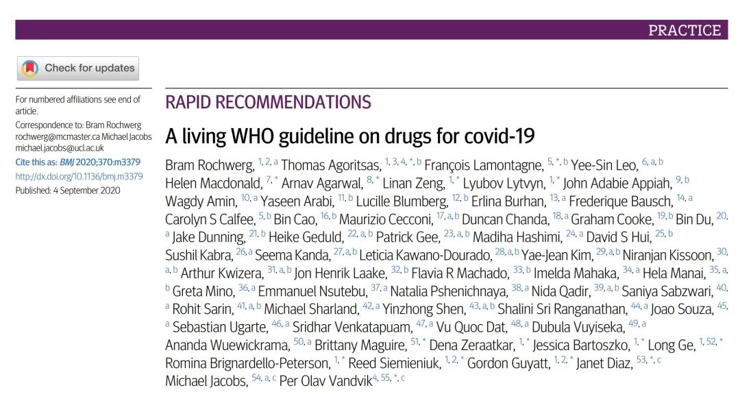 2020年11月20日,世界卫生组织(WHO)于英国医学杂志BMJ更新了关于新冠肺炎治疗药物指南。此动态更新版本替代了2020年9月4日发布的旧版本和7月2日BMJ对于瑞德西韦的建议。