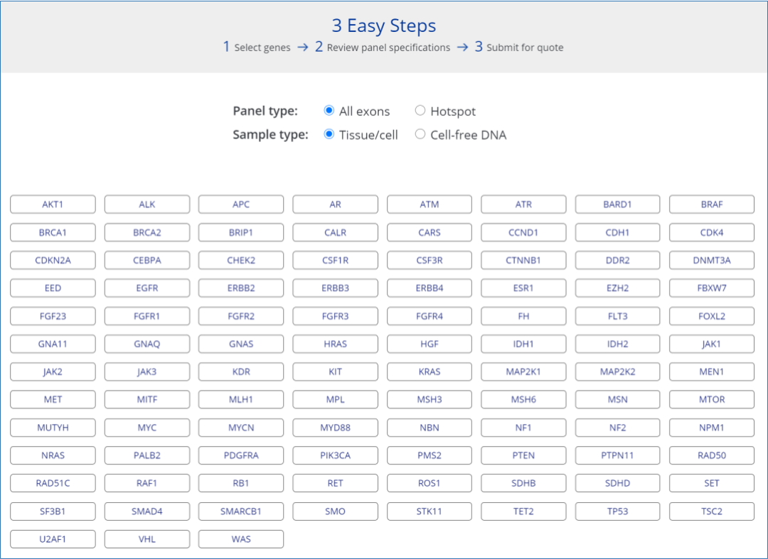 如下图所示: 图:Augury™NGS Panel设计流程 (来源/阅尔基因官网) 4. 交付周期短 用户可自主选择构建覆盖目标基因全部编码区(外显子)的panel,或者选择热点区域。预期可在2天内完成定制化panel的设计,并在12周内完成实验验证。 更多有关Augury™的信息及询价请点击文末阅读原文。 |