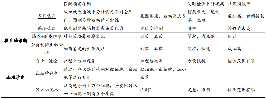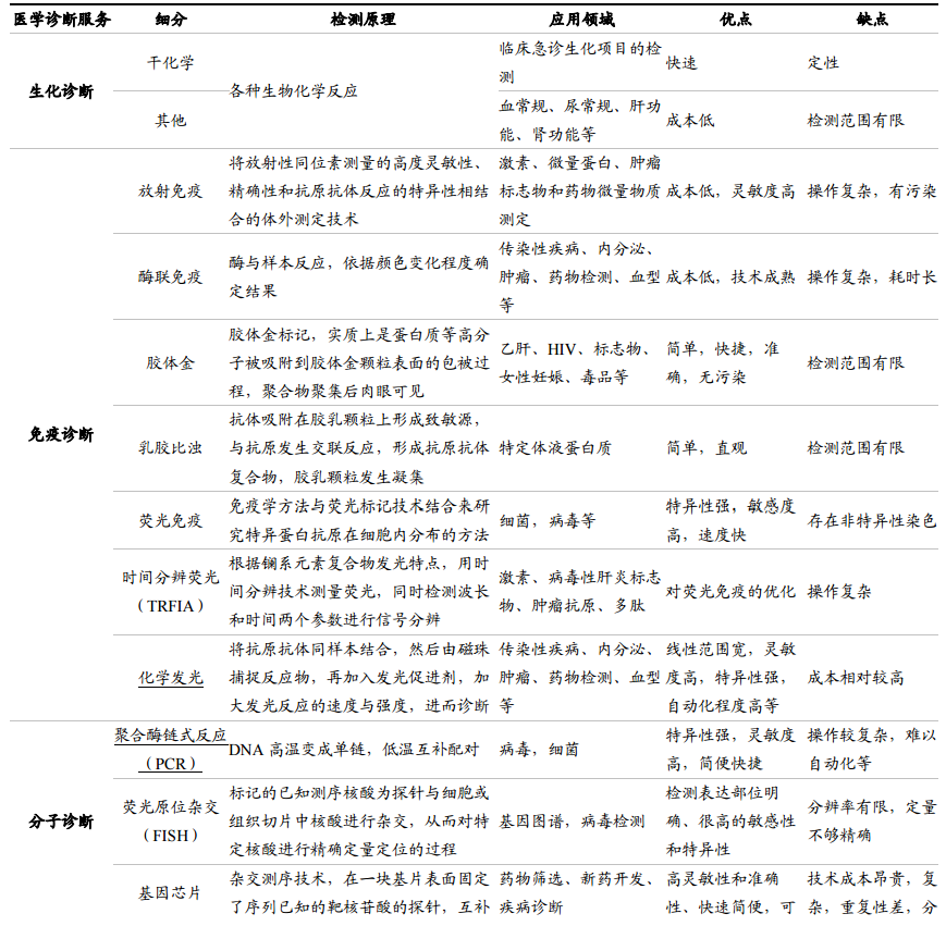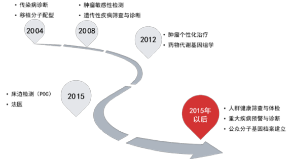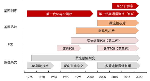 1、PCR行业:居分子诊断黄金赛道,市场规模有望长期高增 1.1比较优势+技术迭代驱动分子诊断持续领跑IVD行业 分子诊断主要是应用分子生物学方法检测生物体内遗传物质的结构或表达水平的变化而做出诊断的技术。与其他主要的体外诊断方法相比,一方面,由于分子诊断可以从基因层次进行检测,因此在检测灵敏度和准确性上优势明显;另一方面,分子诊断可以实现在感染初期识别病毒,或提早确认基因缺陷,这是生化检测(侧重于已经发生疾病的检测)和免疫诊断(侧重于已经感染的疾病检测)难以实现的,因此在传染性疾病检测、肿瘤个体化诊疗、血液筛查、产前筛查、遗传性疾病筛查、药物代谢基因组学等领域应用上具有独特的优势,临床及科研应用市场巨大。 图1:体外诊断主要方法分类及优缺点 (资料来源:武汉华美生物《主要体外诊断方法及优缺点》) 回顾分子诊断半个世纪以来的发展历程,技术层面上,分子诊断取得了“三大转化、三大提升”,即报告信号检测从放射核素标记向荧光标记转化,操作方法由手工操作向全自动化转化,检测分析通量从单一标志物向高通量多组学联合判断转化;检测灵敏度、精密度、特异性快速提升。商业化层面上,一方面是应用热点随着时间推移不断发展变化,应用领域不断拓展;另一方面是技术快速迭代使得成本快速下降。以分子诊断中目前最前沿的基因测序技术为例,在早期只有第一代测序技术时开展的人类基因组计划预算高达30亿美元,但随着新一代测序技术的发明,基因测序成本以“超摩尔定律”速度的下降。目前,测定一个人类的全基因组成本不到1000美元,甚至部分检测机构声称仅需600美元便可实现。 图2:分子诊断的发展阶段 (资料来源:《体外诊断试剂研发及市场发展概况》袁银池等,浙商证券) 图3:分子诊断应用领域时间轴 (资料来源:《我国分子诊断行业步入快速成长期——分子诊断行业发展格局及趋势分析》于有银,浙商证券) 图4:DNA测序成本:每百万碱基对($/Mbp)