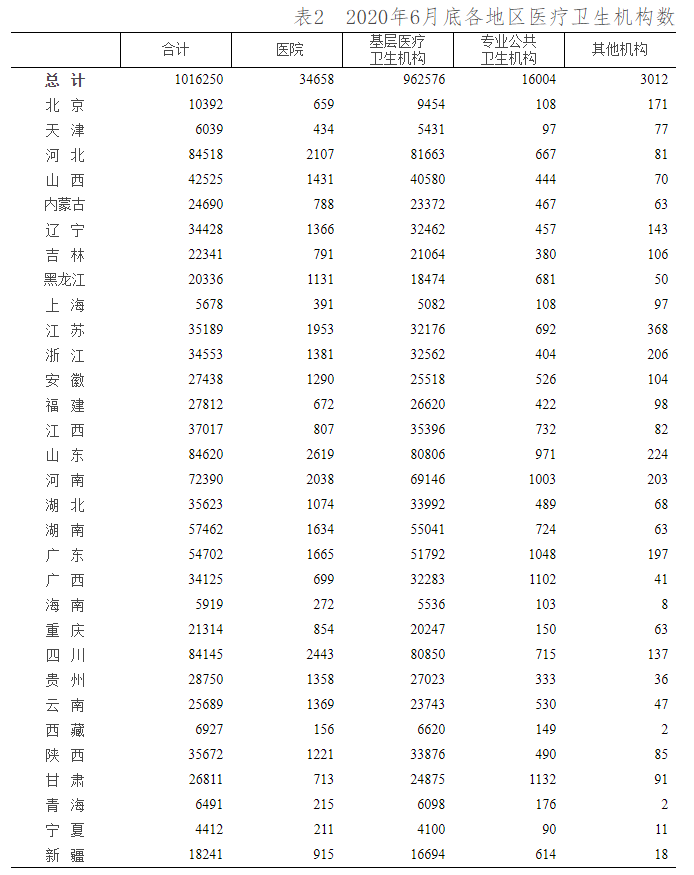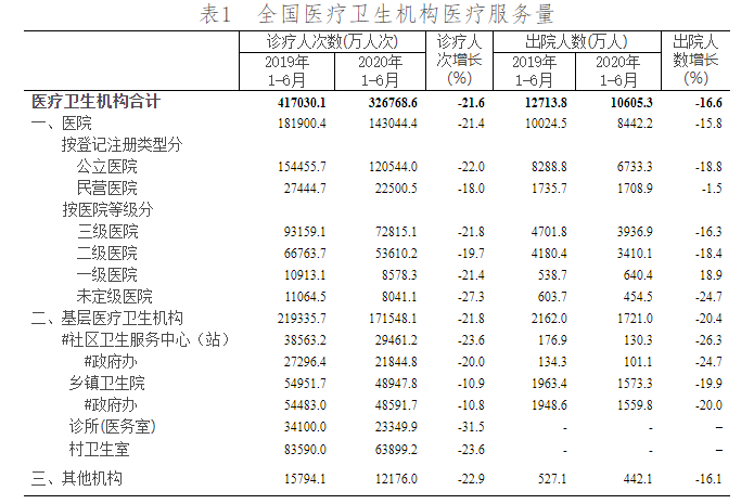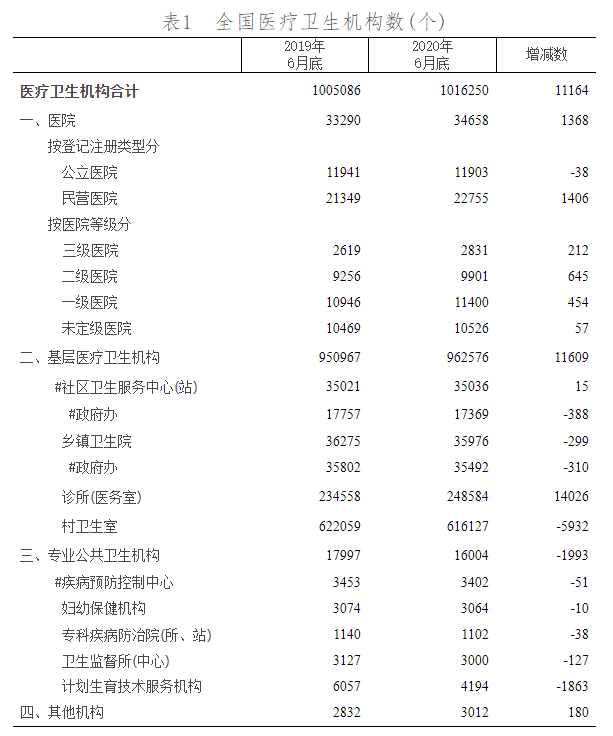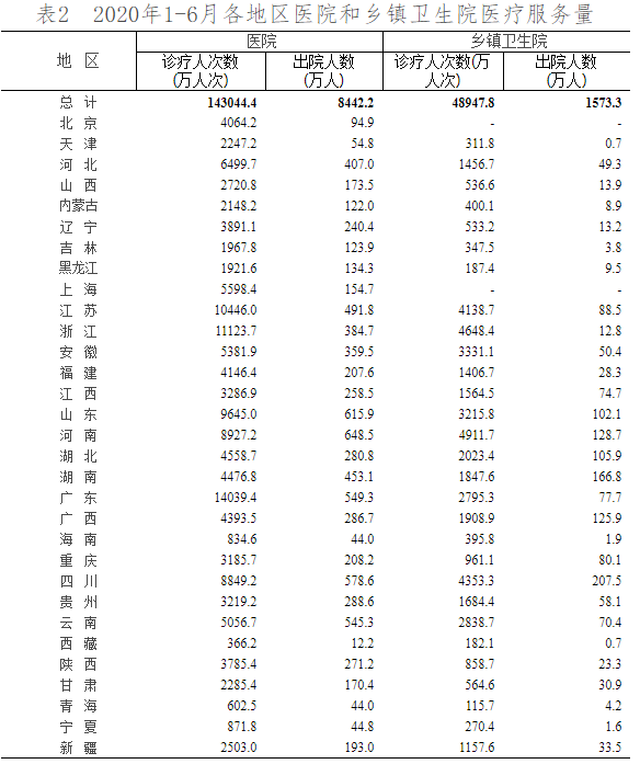 据国家统计局显示,截至2020年6月底,全国医疗卫生机构数达101.6万个。与2019年6月底比较,全国医疗卫生机构增加11164个,其中:医院增加1368个,基层医疗卫生机构增加11609个,专业公共卫生机构减少1993个。 截至2020年6月底,医院3.5万个,其中:公立医院1.2万个,民营医院2.3万个。与2019年6月底比较,公立医院减少38个,民营医院增加1406个。 基层医疗卫生机构96.3万个,其中:社区卫生服务中心(站)3.5万个,乡镇卫生院3.6万个,村卫生室61.6万个,诊所(医务室)24.9万个。与2019年6月底比较,社区卫生服务中心(站)、诊所增加,乡镇卫生院、村卫生室减少。 专业公共卫生机构1.6万个,其中:疾病预防控制中心3402个,卫生监督所(中心)3000个。与2019年6月底比较,疾病预防控制中心减少51个,卫生监督所(中心)减少127个。 从全国各地区医疗机构数来看,河北省、江苏省、山东省、河南省、四川省、广东省等公立医院数目均超过了1800家,而基层医疗市场的大盘同样分布在上述省份。 次均门诊费用 人均住院费用 诊疗人次 2020年1-6月,全国医疗卫生机构总诊疗人次达32.7亿人次,同比下降21.6%。 医院14.3亿人次,同比下降21.4%,其中:公立医院12.1亿人次,同比下降22.0%;民营医院2.2亿人次,同比下降18.0%。 基层医疗卫生机构17.2亿人次,同比下降21.8%,其中:社区卫生服务中心(站)2.9亿人次,同比下降23.6%;乡镇卫生院4.9亿人次,同比下降10.9%;村卫生室诊疗人次6.4亿人次。 出院人数 2020年1-6月,全国医疗卫生机构出院人数达10605.3万人,同比下降16.6%。 医院8442.2万人,同比下降15.8%,其中:公立医院6733.3万人,同比下降18.8%;民营医院1708.9万人,同比下降1.5%。 基层医疗卫生机构1721.0万人,同比下降20.4%。 其他机构442.1万人。 病床使用情况 参考资料:国家统计信息中心 |
