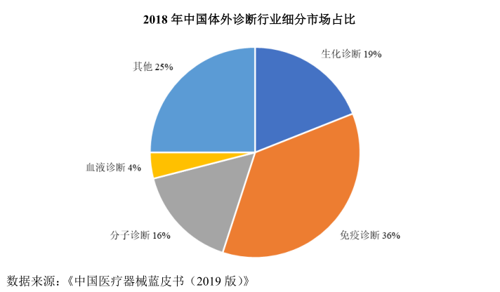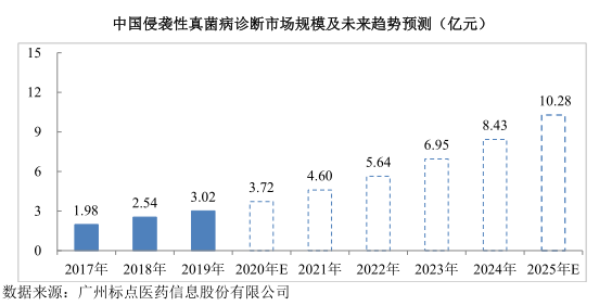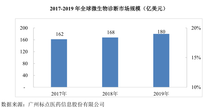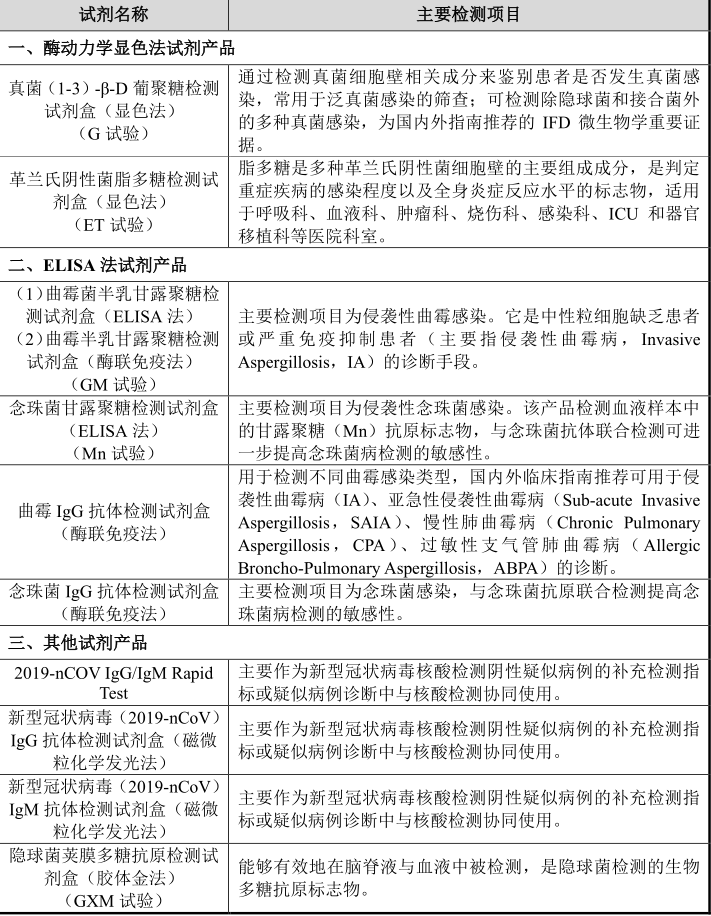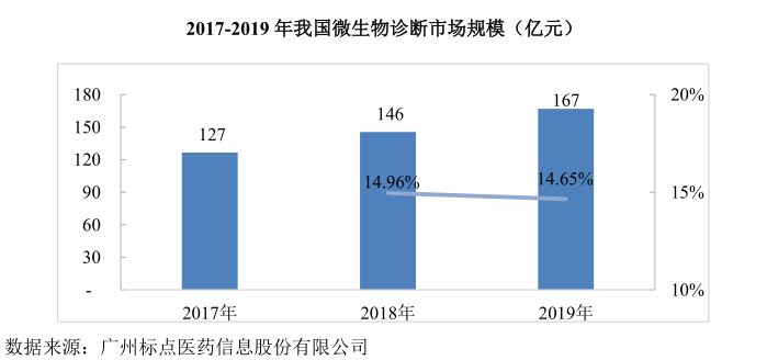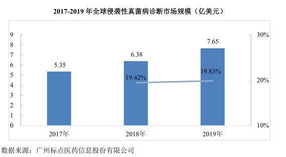 体外诊断主要应用于临床疾病诊断、术前传染病筛查、体检等场景,在居民健康理念提升和人口老龄化趋势等因素的推动下,体外诊断需求持续扩张,未来增长空间较大。一方面,随着人们生活水平的日益提高,人们的健康意识和保健理念逐渐增强,“预防为主,防治结合”的观念更加深入人心,人们对疾病预防以及诊断的准确性更加重视。早期诊断与治疗效果监测的需求持续增长,这些因素将促进体外诊断产业的不断发展。 市场概况: 按照检测原理和检测方法划分,体外诊断可主要分为生化诊断、免疫诊断、分子诊断和 POCT 诊断四大类。 2018 年全球体外诊断市场中免疫诊断约占 32.50%,是占比最高的细分市场;生化诊断占 23.69%、分子诊断占 14.68%,其他检测方法占 29.13%。 我国体外诊断行业起步较晚,但发展较快。与发达国家相比,我国体外诊断行业仍处在发展前期,尽管市场规模仍较小,但随着我国医疗健康水平的不断提高、居民收入及生活水平的改善等,近年来我国体外诊断行业一直保持约 18%的增长速度,远超全球平均水平。 近年来,国内体外诊断市场的主导方向已逐渐从生化诊断向免疫诊断和分子诊断领域转移,其中免疫诊断已成为我国体外诊断市场中占比最大的细分领域。自 2010 年到 2018 年,国内体外诊断市场中生化诊断的市场份额由 27%降低至19%,免疫诊断的市场份额由 27%增加至 36%,远超其他细分领域。 病原微生物诊断行业概况 微生物诊断是指从病人的痰、尿、血液、穿刺液(胸腹水、关节液、心包液)、脑脊液、化脓及创伤口等处获取样本,通过培养、免疫、分子和质谱等实验室技术鉴定菌种(属),为临床传染性疾病的预防、诊断、治疗和疗效观察提供依据。病原微生物诊断细分领域众多,不仅包括乙型肝炎(HBV)、丙型肝炎(HCV)、人乳头瘤(HPV)、艾滋病(HIV)等临床常见病毒检测,也包括细菌、衣原体支原体、侵袭性真菌病诊断等特色细分领域。 (1)全球病原微生物诊断行业市场规模 微生物诊断有助于发现和辨别不同的病原微生物,可协助医生确定适当的抗菌药种类和剂量,从而达到有效治疗和控制感染的目的;通过细菌、真菌的实时监测,有助于实现患者的临床管理。除此以外,微生物诊断还有助于防范生物恐怖袭击和流行病爆发等威胁公共卫生的事件,如席卷全球的新冠肺炎疫情,让人们重新认识了病原微生物和传染病的恐怖性及危害性。2019 年全球微生物诊断市场销售额突破 180 亿美元,随着各国对微生物诊断重视度的不断提高,病原微生物诊断市场前景广阔。 (2)我国病原微生物诊断行业市场规模 我国微生物诊断领域起步较晚,近年来,随着人们对微生物诊断认识的不断提高和利好政策的不断出台,我国微生物诊断市场规模不断增长,2019 年市场规模达到 167 亿元。 侵袭性真菌病诊断行业发展情况 侵袭性真菌病是指真菌侵犯人体皮下黏膜组织、血液和内脏器官等所引起的真菌感染性疾病。近年来,侵袭性真菌病已逐步成为严重的感染性疾病,是威胁人类健康与生命的顽凶之一。 (1)全球侵袭性真菌病诊断行业市场规模 全球侵袭性真菌病诊断市场在全球病原微生物诊断市场中目前占比较低,2019 年突破 7 亿美元,但其成长性较好,过去三年复合增长率超过 19%,随着临床医生对侵袭性真菌病诊断的重视程度不断提高,侵袭性真菌病诊断市场的渗透率将不断提升,市场空间广阔。 (2)我国侵袭性真菌 病诊断行业市场规模 我国侵袭性真菌病诊断市场起步较晚,市场渗透率较低,目前多在三级医院及专业的第三方医学检验实验室开展,2019 年突破 3 亿元,但成长性较好,三年复合增长率超过 20%。在发展中国家,侵袭性真菌病诊断主要基于表型鉴定以及生化特性检查,但过程十分耗时并且误诊率高。 行业竞争情况: 公司主要国际竞争对手包括: 1)ACC 美国 ACC 公司是一家以经营生命科学产品和技术服务为主营业务,是全球第一家经 FDA 认证的鲎试剂生产企业,主要产品是检测细菌内毒素的 ET 试验产品和泛真菌的 G 试验产品。 2)伯乐 伯乐于 1952 年成立于美国加利福尼亚州,为细胞生物学、基因表达、蛋白质纯化、蛋白定量、药物发现和生产、食品安全和科学教育领域提供仪器、软件、消耗品、试剂等产品和服务。作为全球领先的体外诊断用品供应商,其诊断产品覆盖各类技术平台,并为输血、糖尿病监测、自身免疫和传染病检测市场提供了具有较高价值的临床信息。其在我国的侵袭性真菌病诊断市场中仅有 GM 试验产品,产品较为单一。 3)IMMY IMMY 公司于 1979 年创立于美国,专注于生产真菌诊断产品,以帮助全球降低感染性疾病导至的超高死亡率。IMMY 致力于在全球范围内提高诊断水平,尤其发展中国家,如撒哈拉以南非洲等地区,这些地区缺乏基本的医疗设备,无法为患者提供良好的医疗服务。其在我国的侵袭性真菌病诊断市场中仅有 GXM试验产品,产品较为单一。 公司主要国内竞争对手包括: 1)一瑞生物 天津一瑞生物科技股份有限公司成立于 2000 年 3 月 7 日,是国内较早进入侵袭性真菌病诊断市场的企业,其产品主要包括 G 试验、GM 试验和 GXM 试验等检测试剂及其配套仪器。 2)湛江安度斯 湛江安度斯生物有限公司是 Charles River Laboratories International, Inc.(CRL)于 1997 年在华收购后成立的合资企业。湛江安度斯侵袭性真菌病诊断相关产品主要为 G 试验和细菌内毒素检测。 