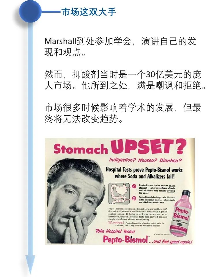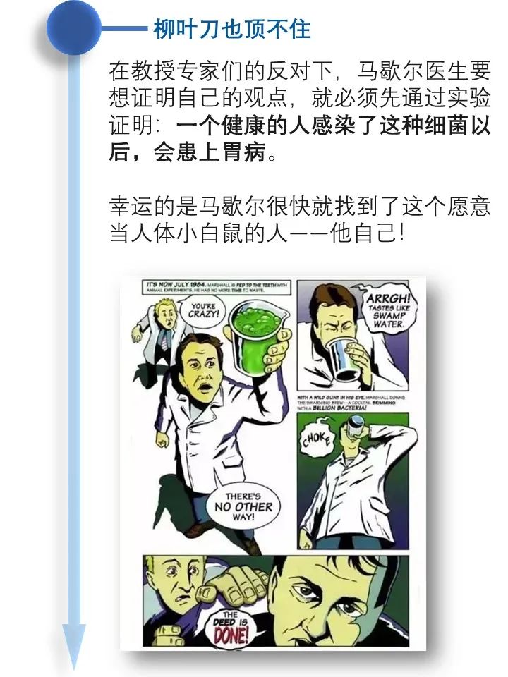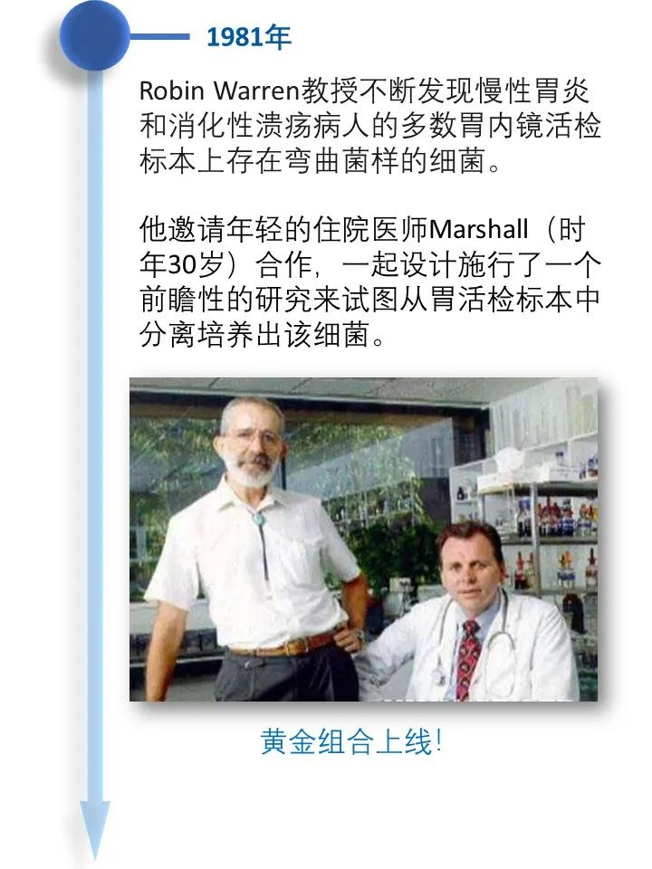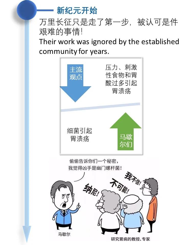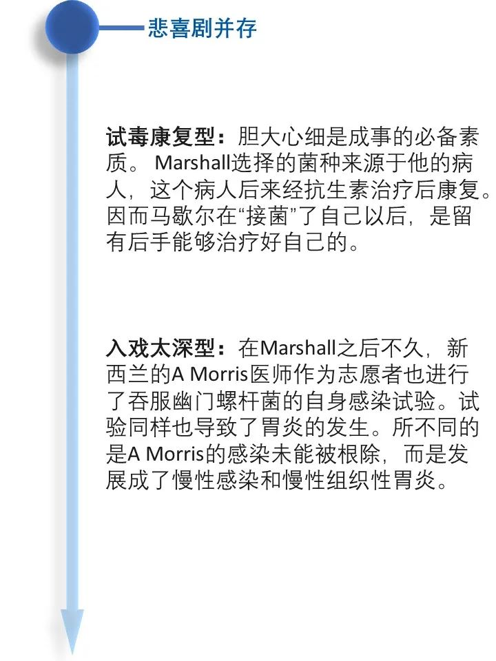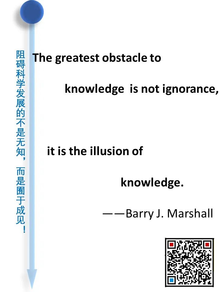 道之所在,虽千万人。吾往矣!  今天借着讲述幽门螺旋杆菌发现的历史过程,回顾了一段以身试菌的精彩故事。 当你坚定的相信自己发现了与常识相悖的事情而得不到众人认可的时候,不要急躁,因为有时候真理真的掌握在少数人手里。这时不放跟马歇尔学一学,找个志同道合的同行者,坚持探索下去,兴许一不小心还能搞到个诺贝尔奖呢! |